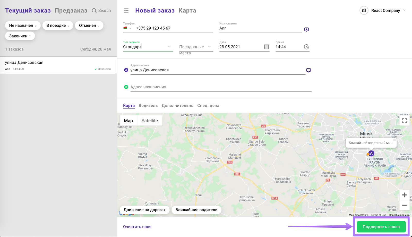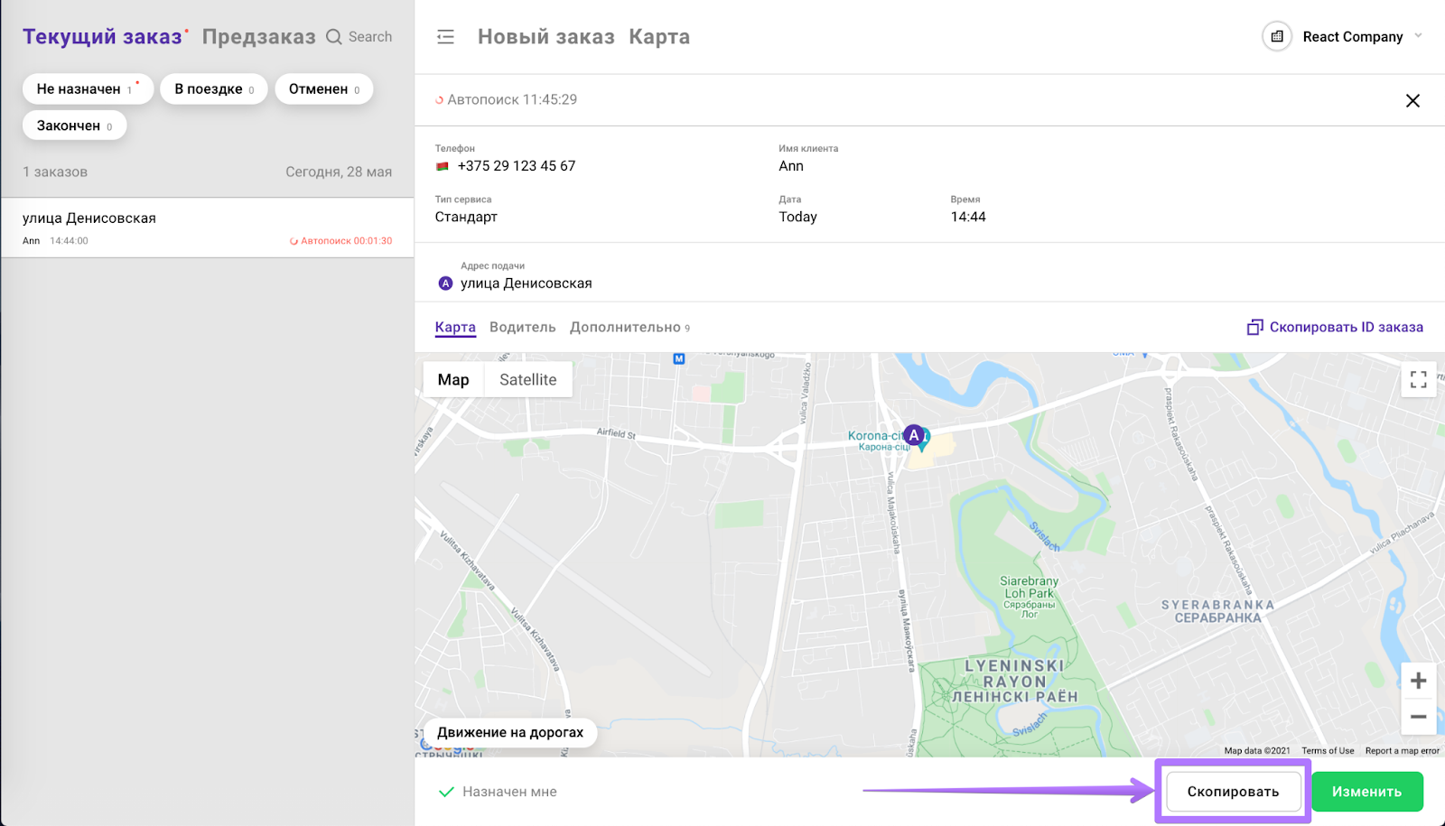 Как только оператор введет нужную информацию на главном экране и нажмет «Подтвердить заказ», он увидит кнопку «Скопировать» в правом нижнем углу приложения оператора.