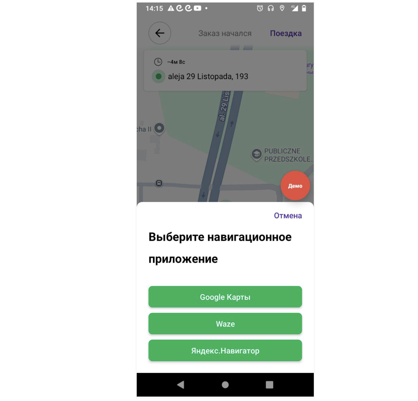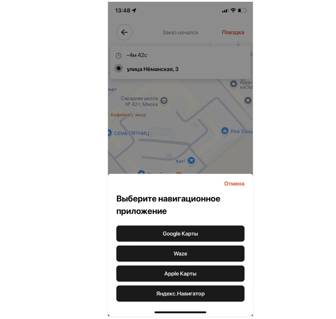 Это означает, что если водитель решит использовать навигацию для какого-либо заказа, то приложение откроет навигатор, выбранный по умолчанию.