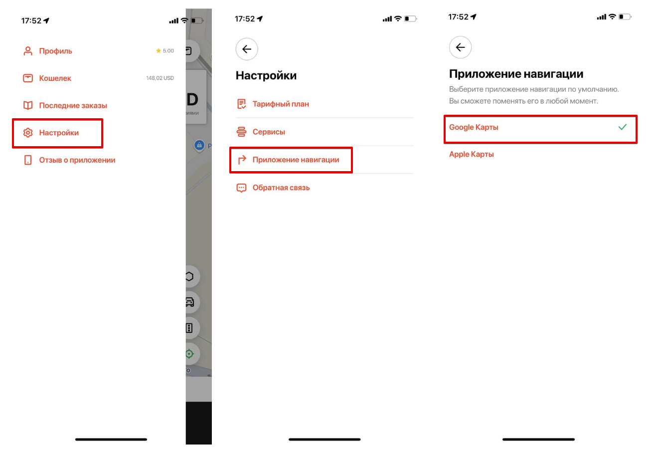 Навигатор по умолчанию можно проверить в боковом меню приложения водителя > Настройки > Приложение навигации. Приложение для навигации по умолчанию можно изменить в любой момент в настройках.
