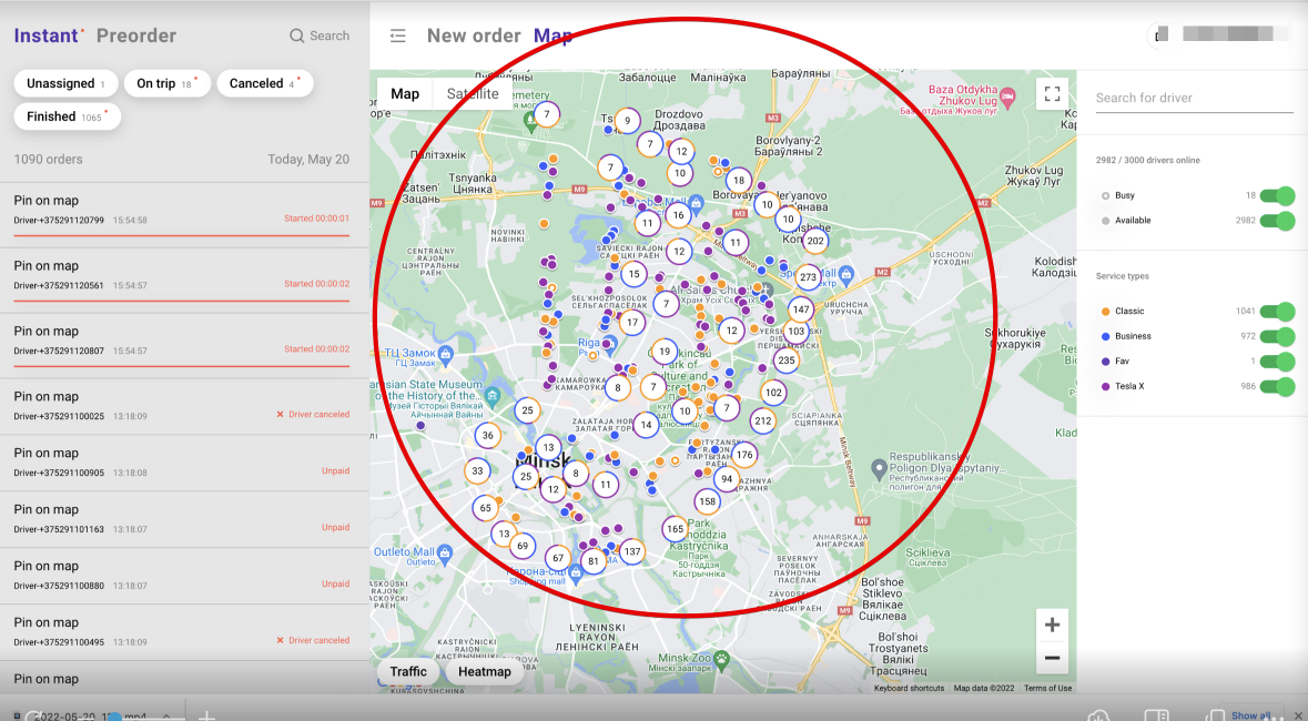 Оператор всегда может проверить наличие свободных водителей любого типа сервиса в конкретной области, если ему нужно вручную назначить водителя на заказ.