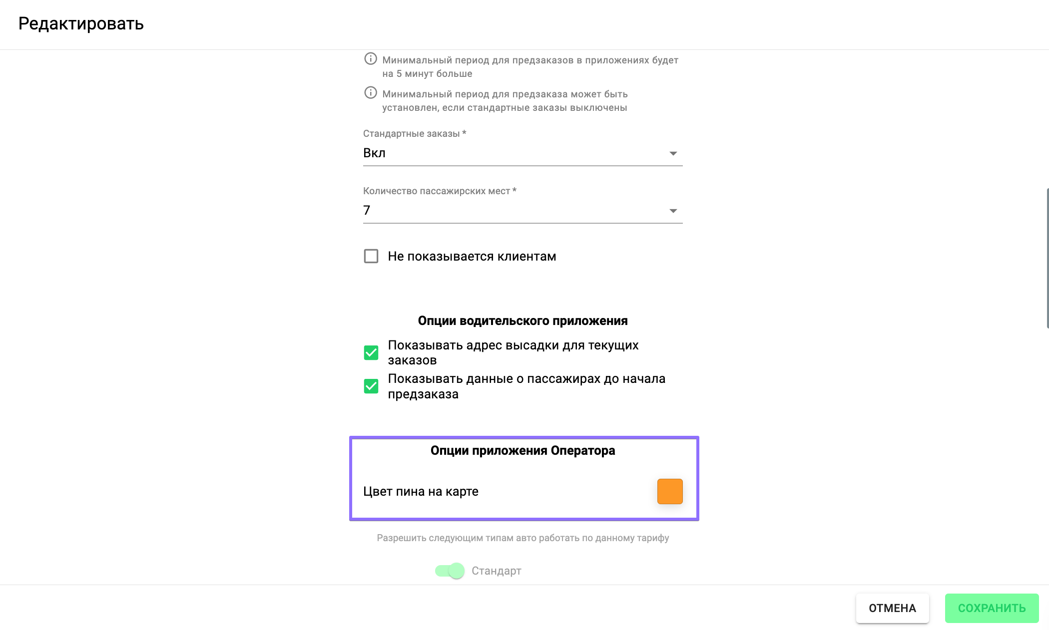 Для каждого типа сервиса можно установить свой цвет. Для этого откройте Сервисы >> выберите нужный тип сервиса >> Общие настройки >> Цвет пина на карте.