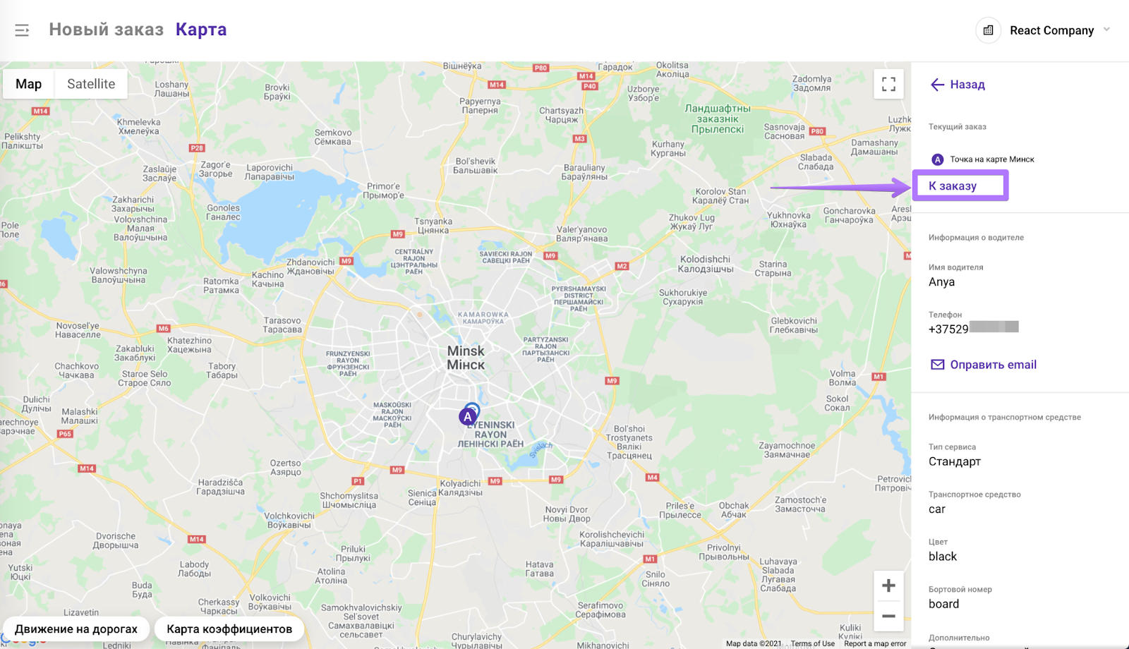 Если водитель выполняет заказ, нажав на его значок на карте, вы сможете перейти по ссылке "К заказу". В открывшемся окне отобразятся детали текущего заказа.