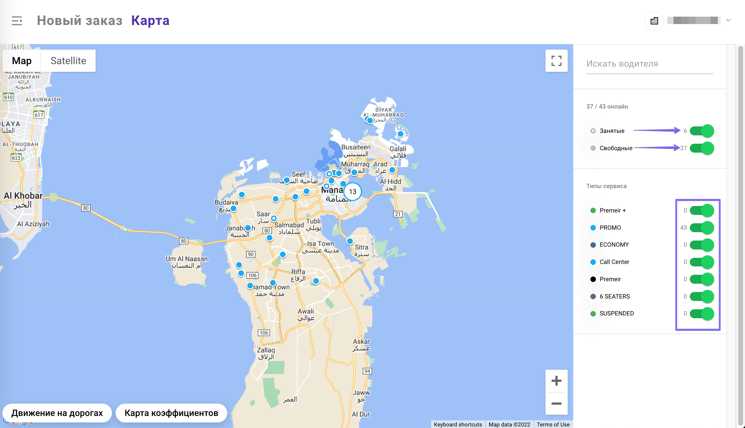В правом верхнем углу экрана находится боковая панель. В ней можно отключить отображение того или иного сервиса на карте и, таким образом, проверять местоположение водителей по типам сервиса.