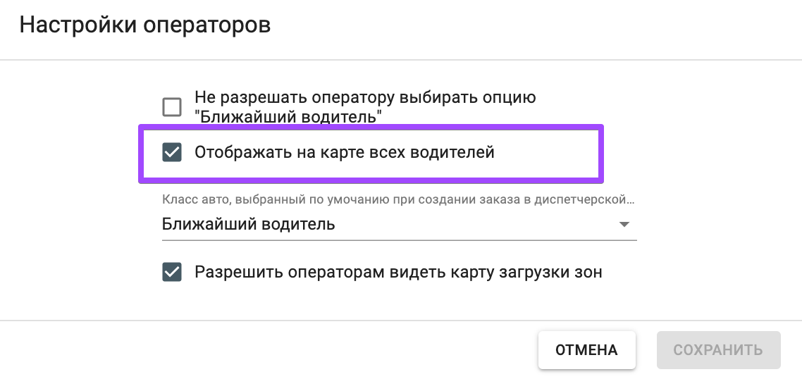 Карту города можно активировать в настройках операторов. Для этого откройте Мой Хаб >> Операторы >> Настройки операторов и поставьте галочку возле “Отображать на карте всех водителей”.