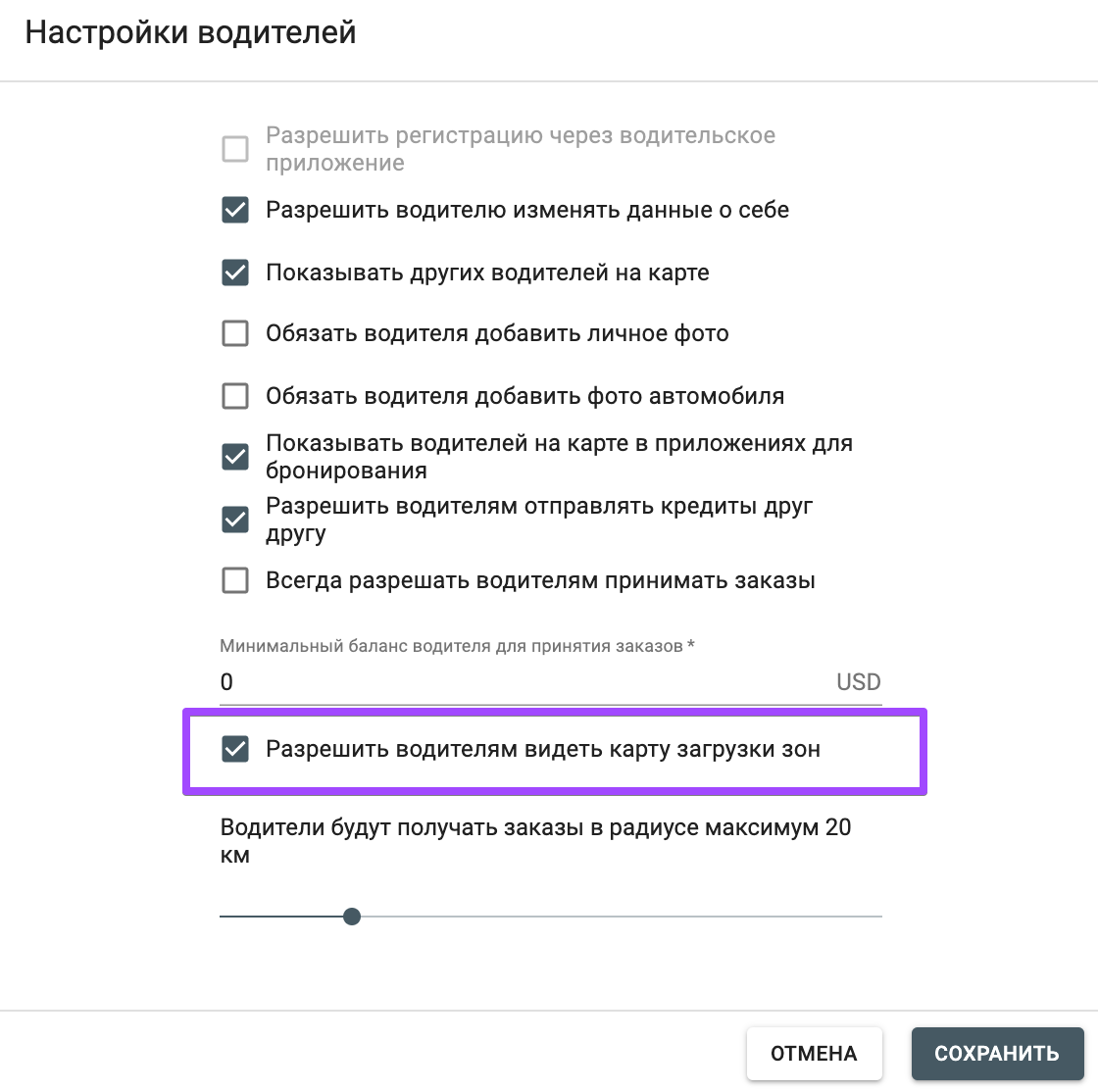 2. Иконка карты загрузки зон позволяет водителю видеть, в каких местах количество заказов превышает количество свободных водителей. Чтобы активировать эту функцию, откройте Мой Хаб >> Водители >> Настройки водителей >> Разрешить водителям видеть карту загрузки зон.
