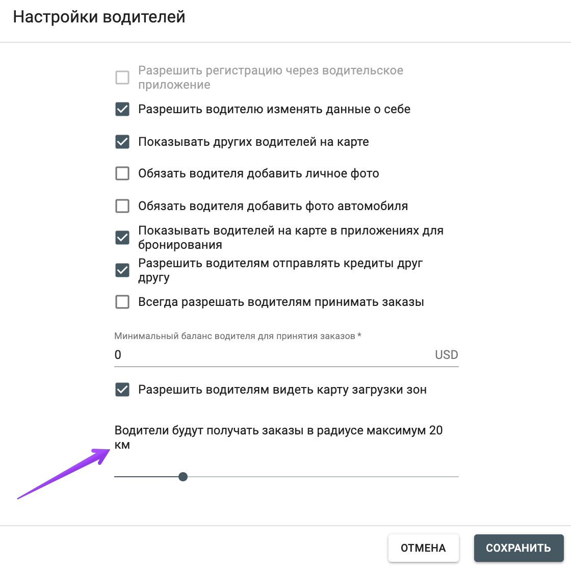 1. “Зона работы водителя” - радиус, в пределах которого водитель будет получать немедленные заказы. Максимальный радиус задается в настройках водителей (Мой Хаб).