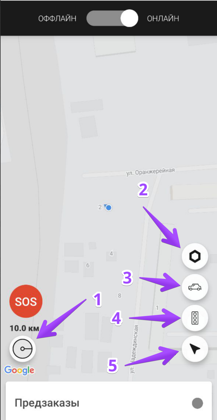 5. «Стрелка для обновления текущего местоположения». При нажатии на эту иконку обновляется текущее местоположение водителя.
