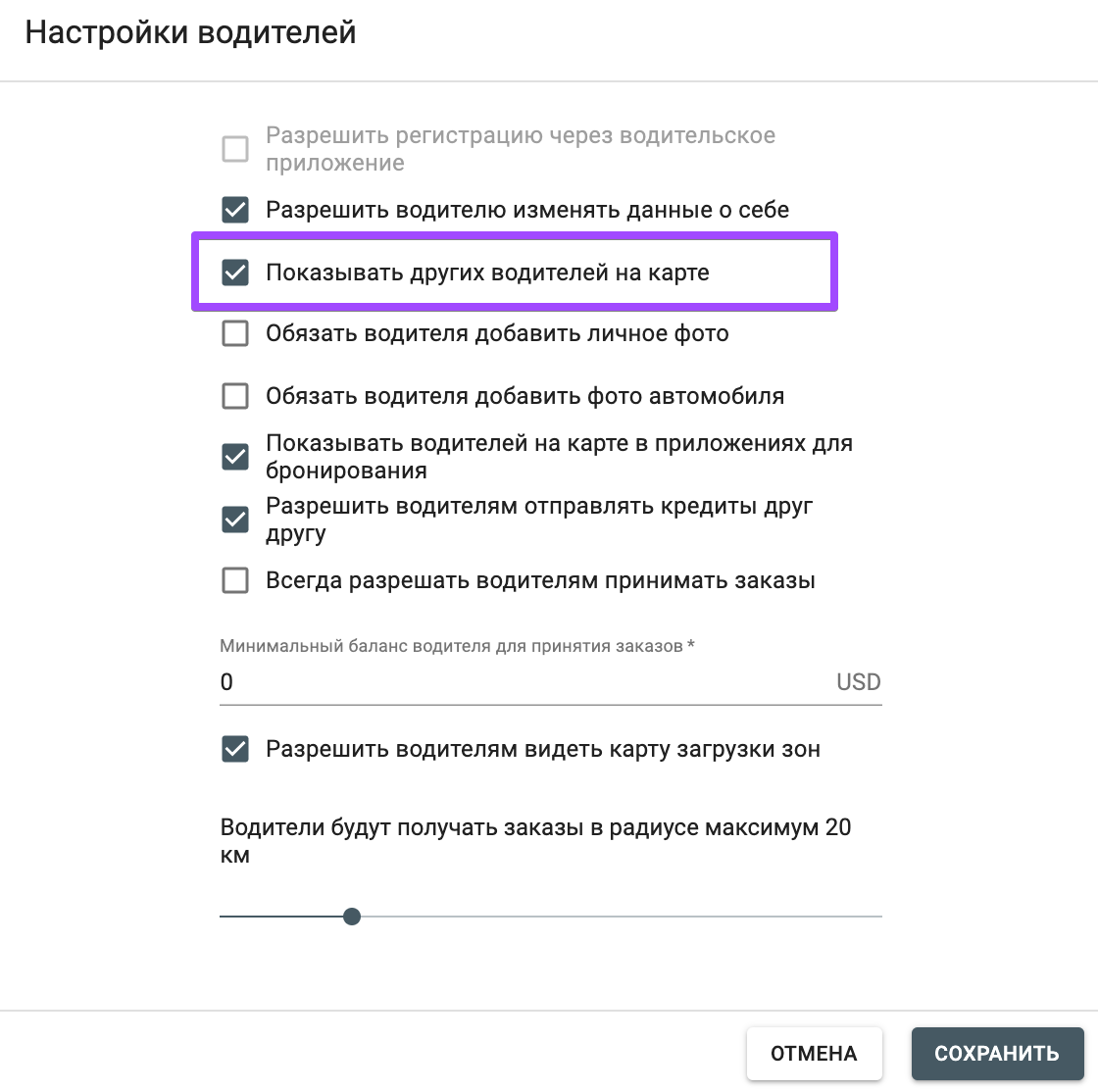 Чтобы активировать эту функцию, откройте Мой Хаб >> Водители >> Настройки водителей >> Показывать других водителей на карте.
