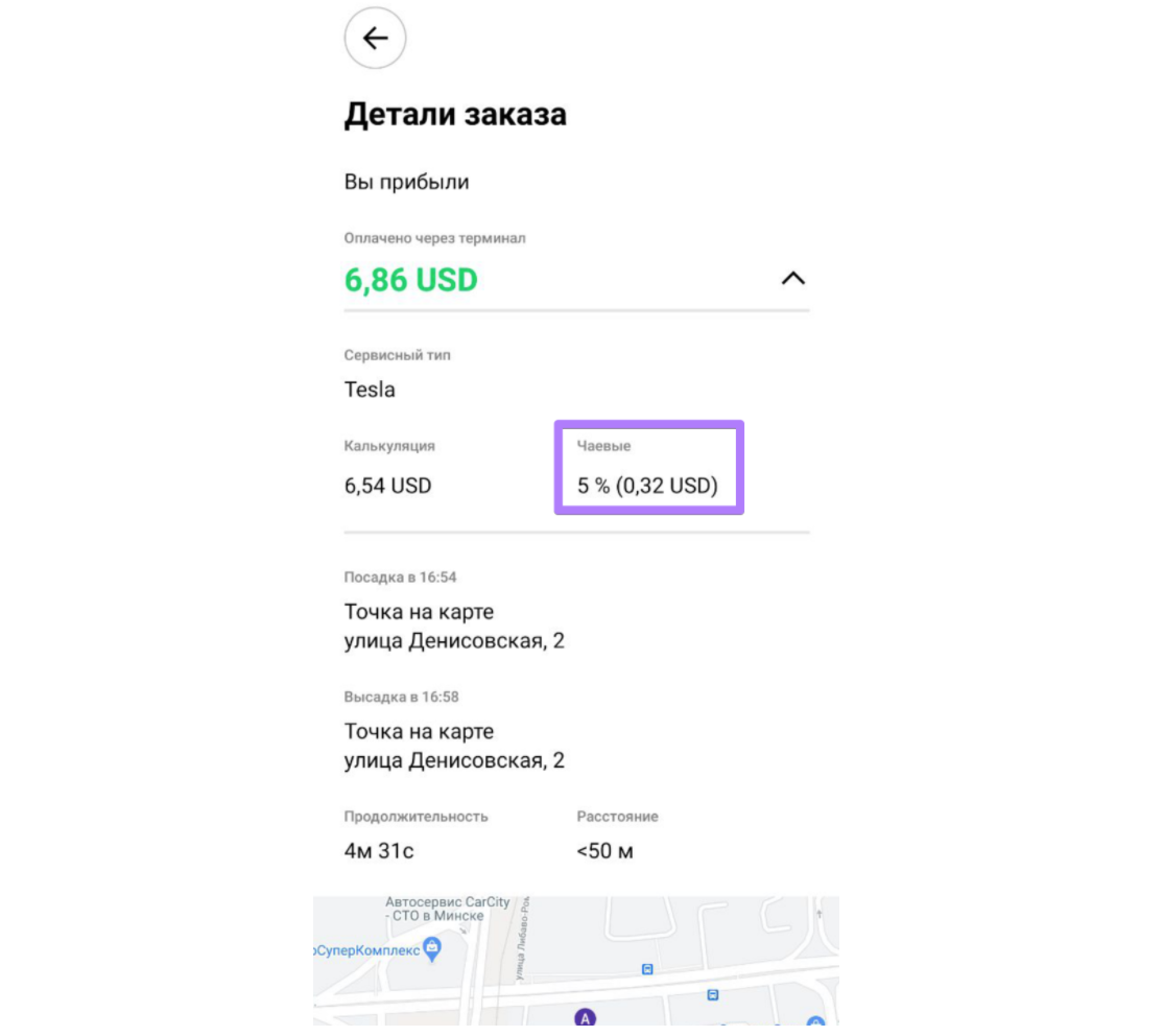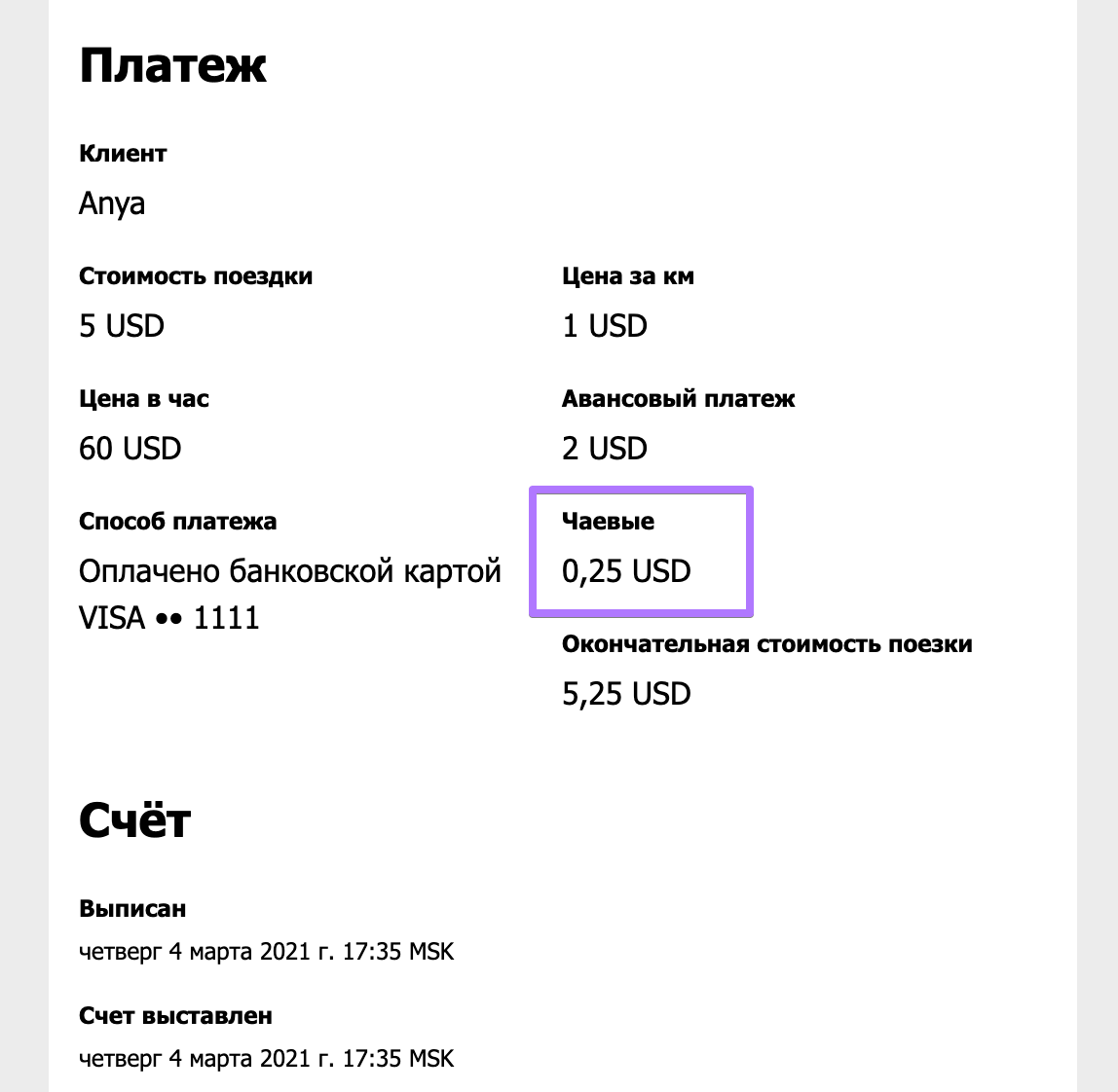 Клиент может просмотреть все детали о поездке и стоимости, включая чаевые, во вкладке приложения “Мои заказы”, а также в деталях поездки, отправляемых на электронную почту клиента.