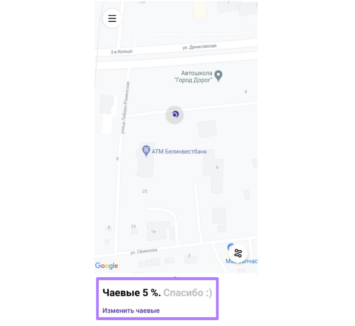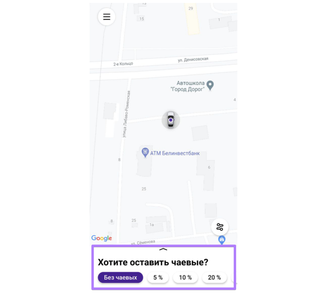 Во время поездки клиент увидит в приложении сообщение о размере выбранных чаевых (если была выбрана оплата картой).