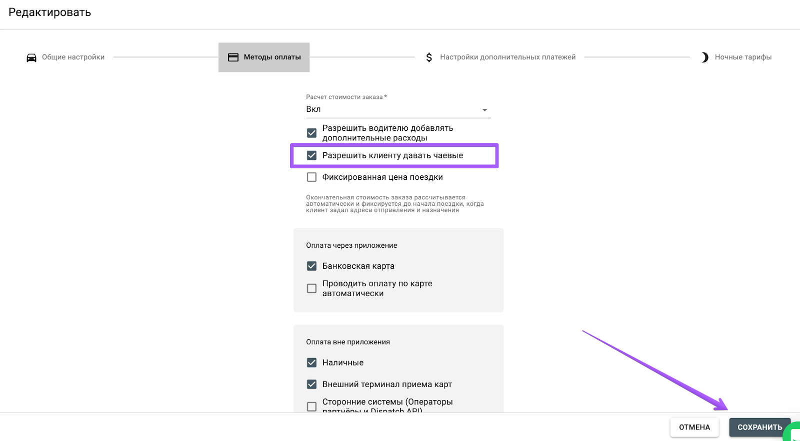 Эту опцию можно активировать в настройках сервисов. Откройте в панели компании вкладку Сервисы >> выберите нужный тип сервиса >> Методы оплаты >> поставьте галочку возле “Разрешить клиенту давать чаевые” >> нажмите “Сохранить”.