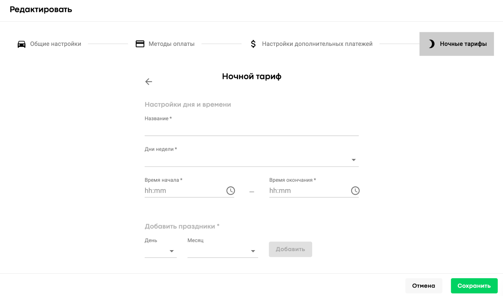 Более того, вы можете добавить несколько ночных тарифов для одного вида сервиса, а также дать им свое название, установить время, дни недели и/или даты, когда они применяются. В названии можно указать период, когда применяется ночной тариф. Например, “Выходные”, “Час пик”, “Праздничный день”.