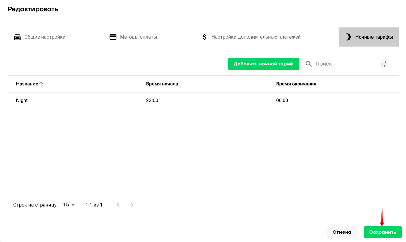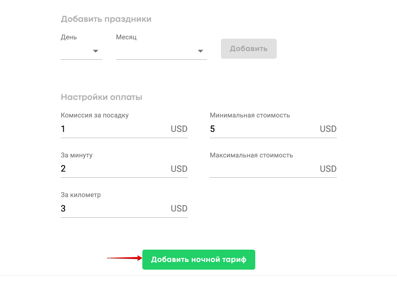 После этого перейдите к “Настройкам оплаты”, которые будут применяться во время работы ночного тарифа - комиссия за посадку, цены за минуту и за километр, максимальная и минимальная стоимость заказа - и нажмите “Добавить ночной тариф”.