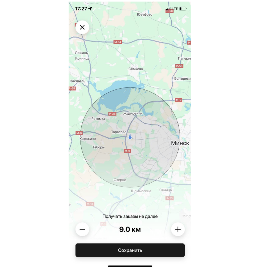 Этот максимальный радиус определяет зону работы водителя. Водители будут получать только те стандартные заказы "на сейчас", место подачи которых находится в пределах их зоны работы. Водители могут уменьшить свою зону работы прямо в приложении.