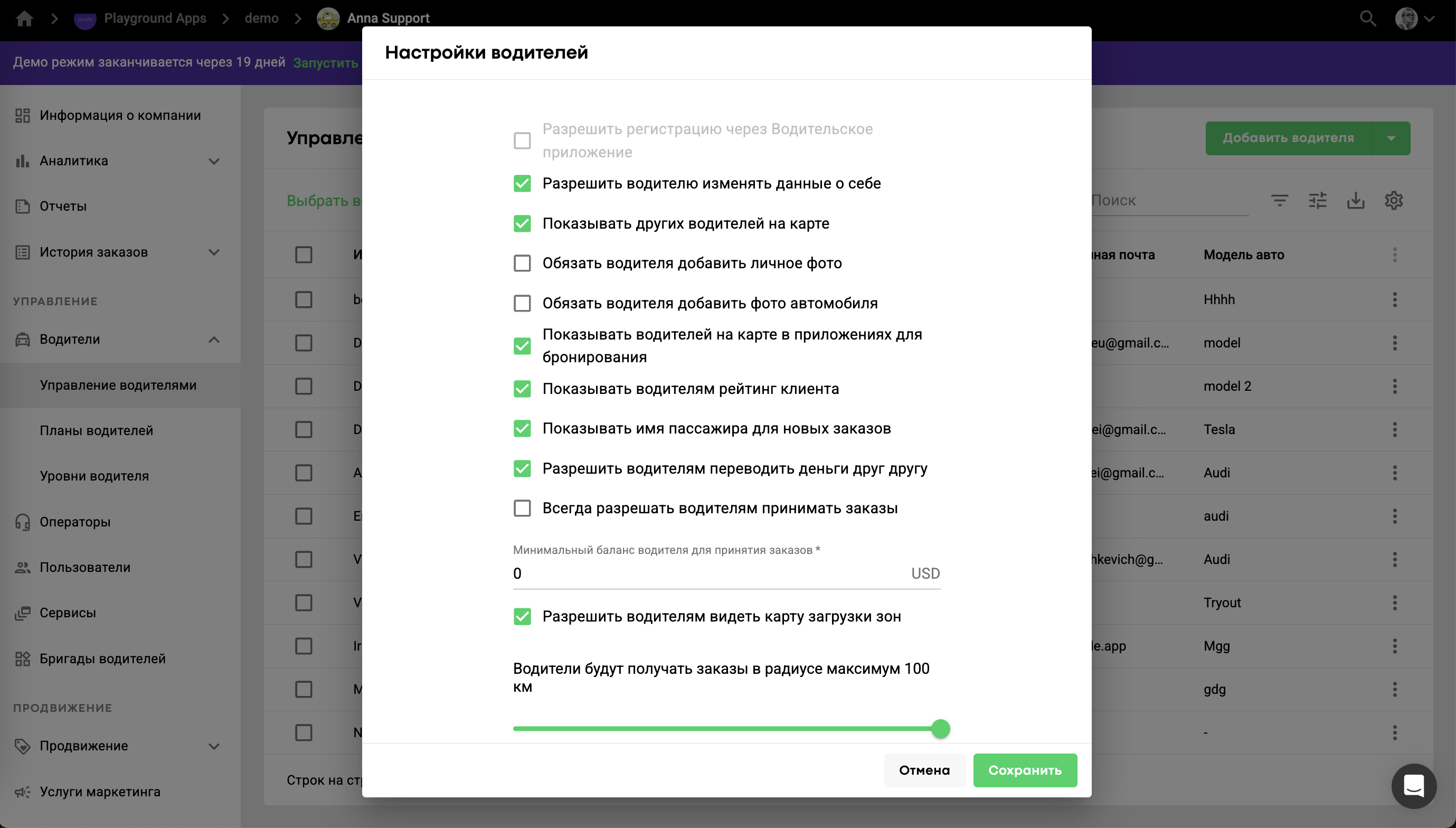 Если поставить галочку, водители смогут принимать заказы с любым балансом.