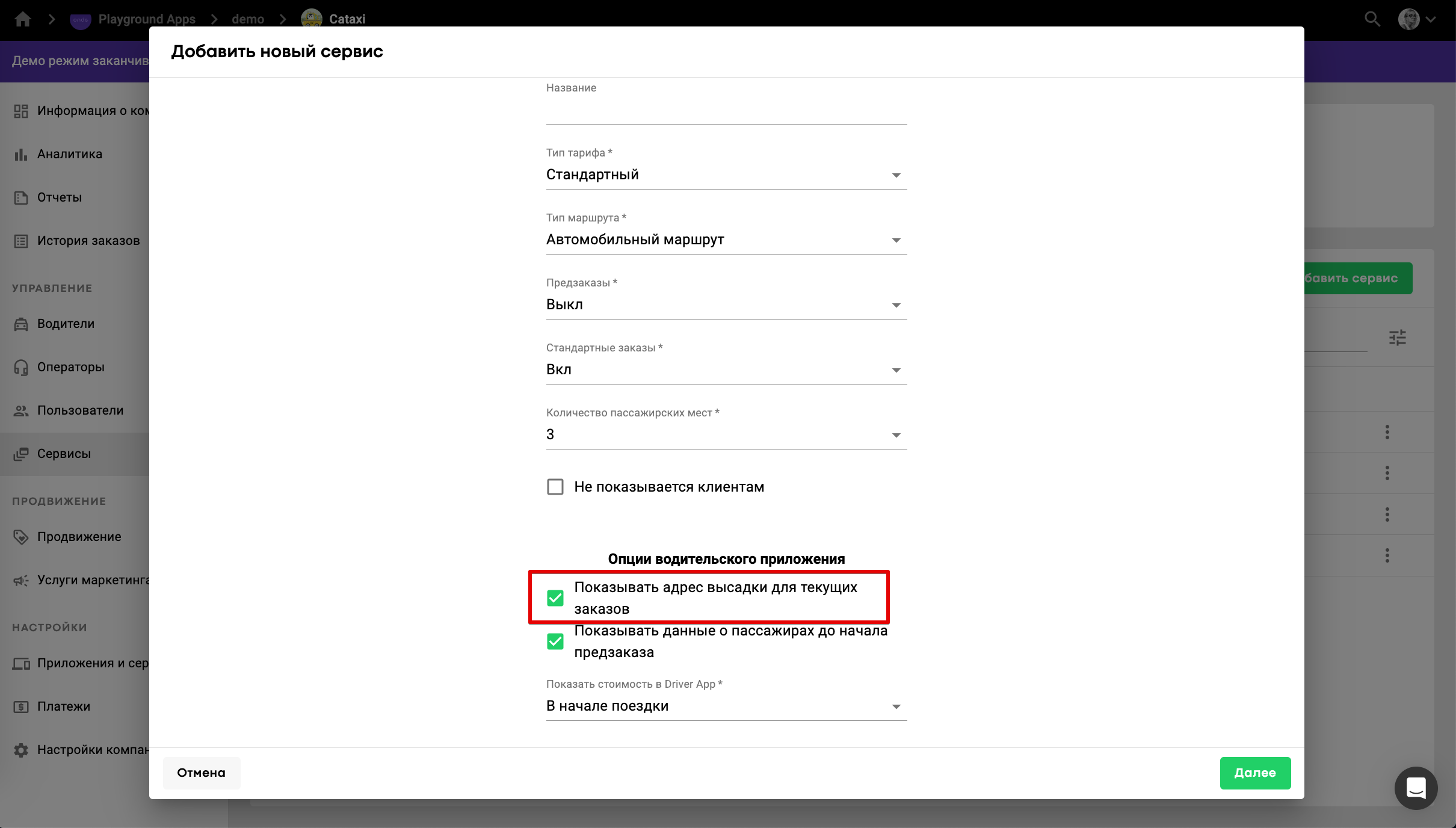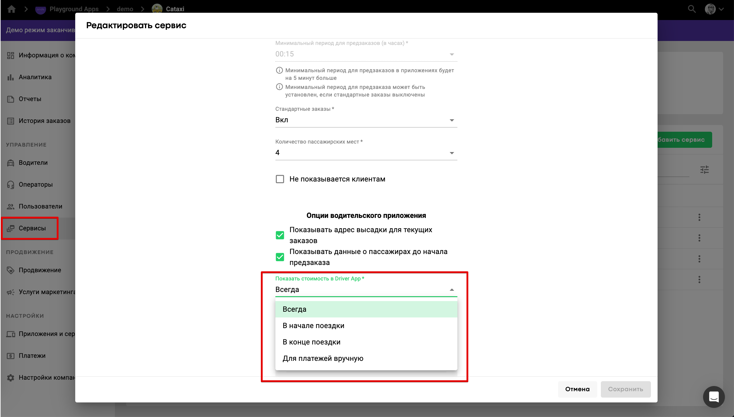 Владелец компании может выбирать, на каком этапе выполнения заказа водители каждого сервиса будут видеть стоимость поездки.