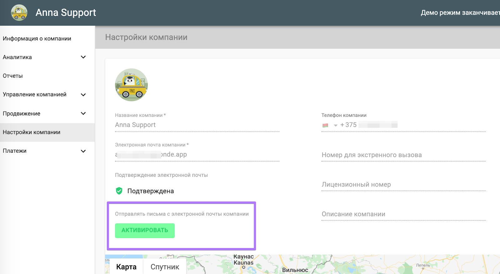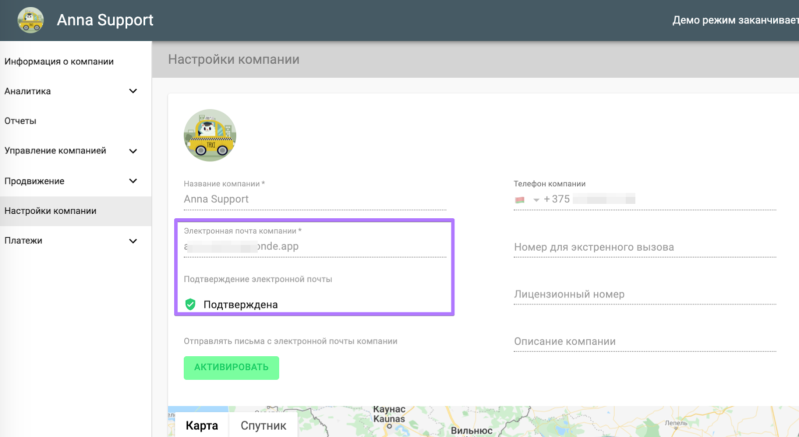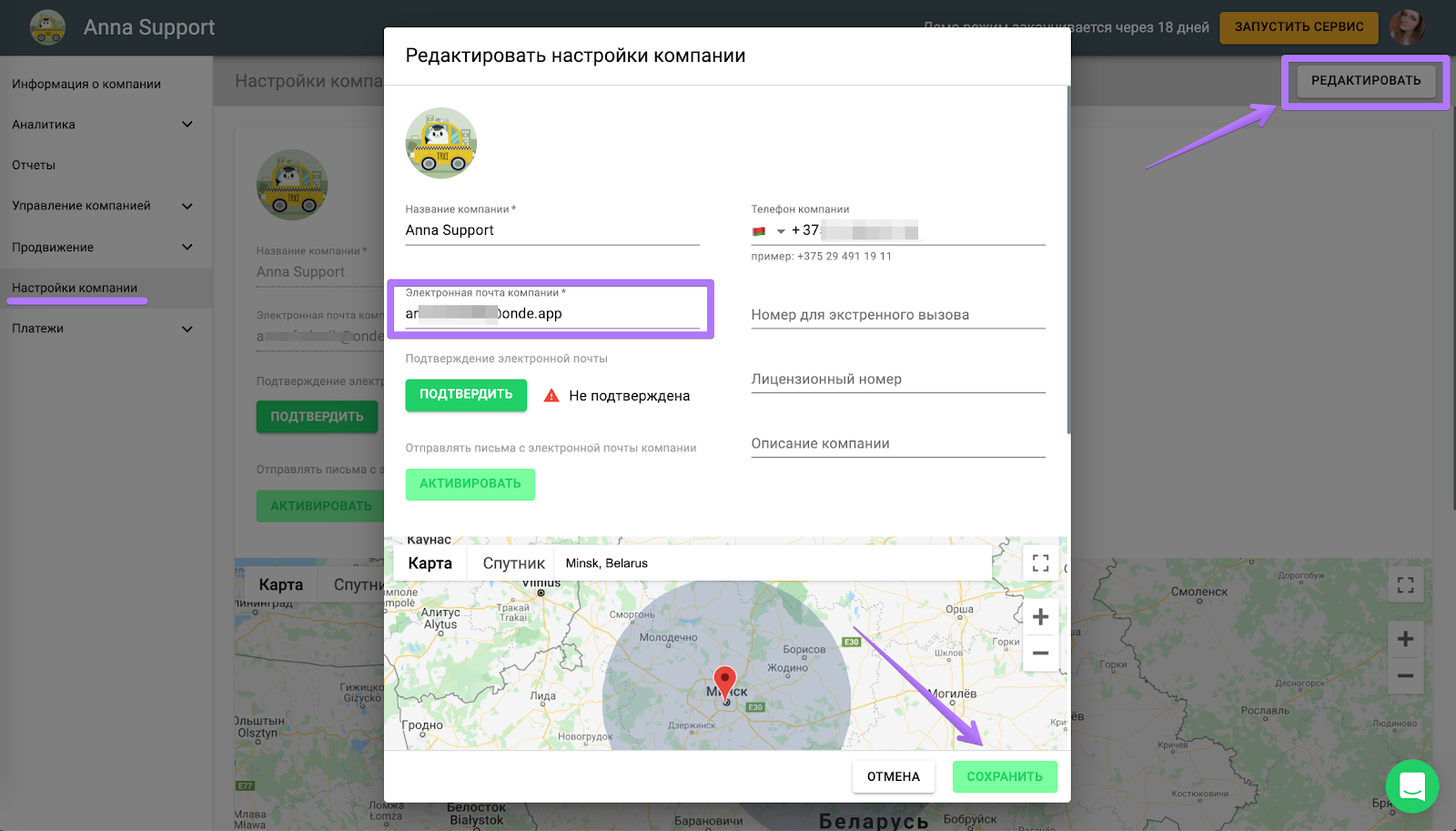 2. Нажмите на “Редактировать” в правом верхнем углу экрана и в поле “Электронная почта компании” введите адрес электронной почты, которую вы хотите использовать как почту вашей компании.