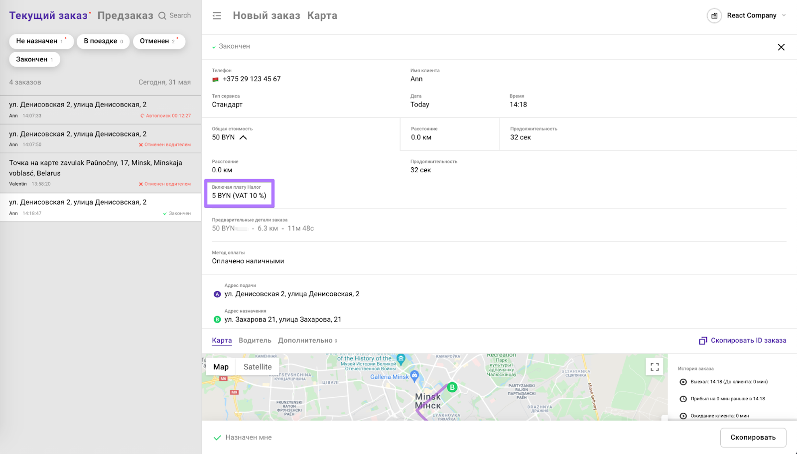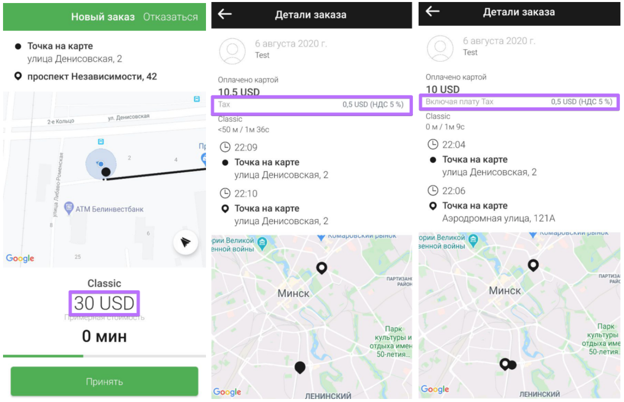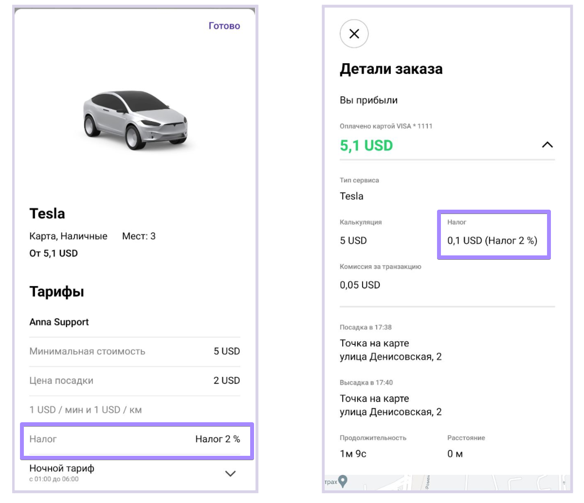 Уведомление о дополнительной комиссии будет отображаться клиентам/ водителям/операторам перед поездкой и регистрируется отдельной строкой в чеках/деталях и истории поездок для клиентов, водителей, операторов и компании. Например: "дополнительная комиссия 10%, НДС добавлен сверх стоимости поездки”.
