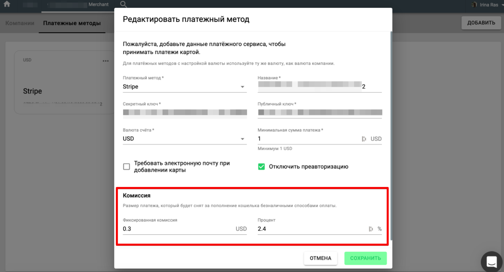 6. укажите комиссию за транзакцию в % / фиксированной стоимостью либо оба варианта и нажмите "Сохранить".