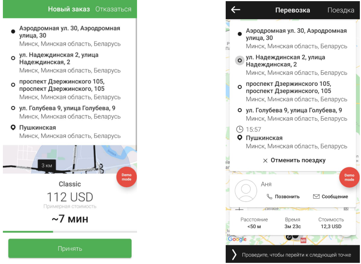 Водитель может увидеть промежуточные остановки на всех этапах выполнения заказа: