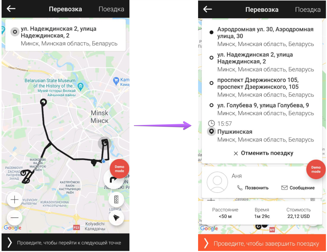 Для того, чтобы обозначить прибытие на промежуточный адрес и перейти к следующей точке, водитель должен провести по полосе на экране приложения, следуя этой логике до конечной остановки.