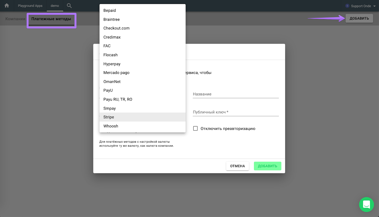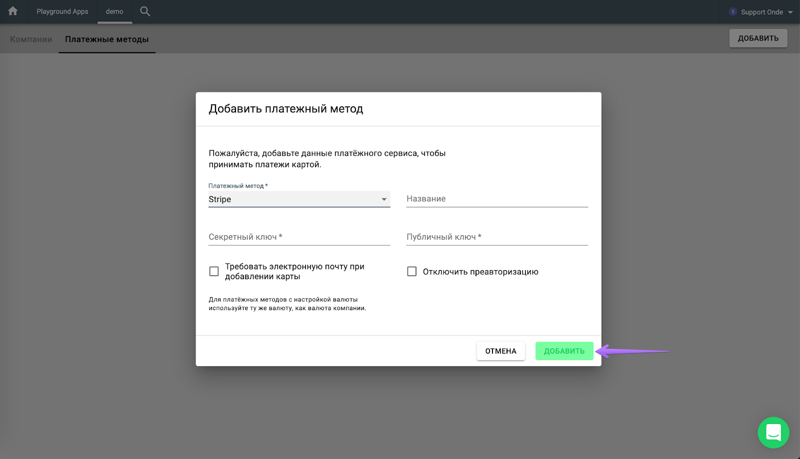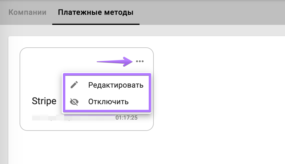 Чтобы активировать платежный метод для компании, выполните следующие шаги: