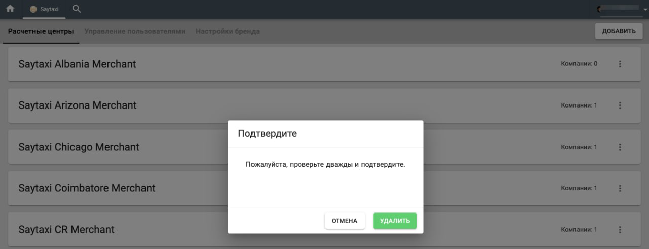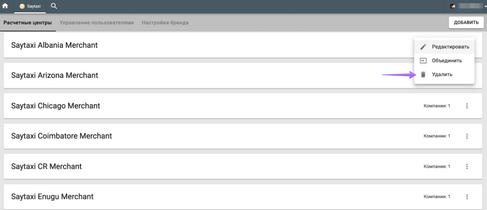 Чтобы удалить расчетный центр, откройте вкладку Расчетные центры > выберите расчетный центр, который хотите удалить > кнопка “Еще” > Удалить > подтвердите действие, еще раз выбрав “Удалить”. Данная опция предназначена для удаления случайно добавленных расчетных центров, в которых нет ни одной компании. Если в расчетном центре есть компании, удалить его можно только путем объединения с другим расчетным центром.