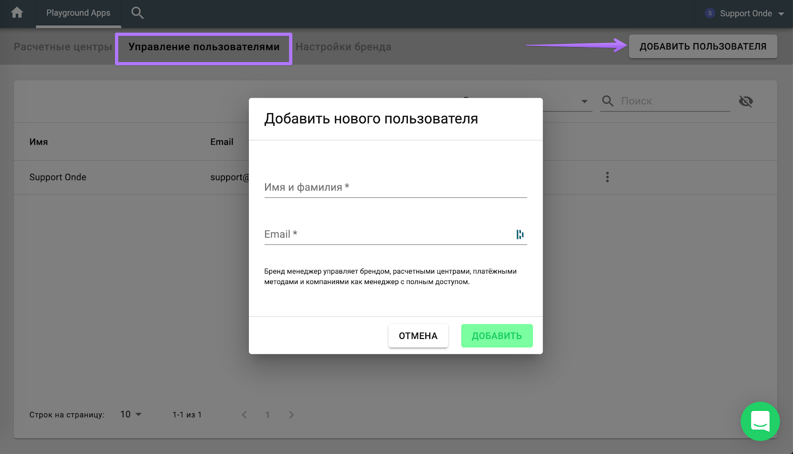 Чтобы добавить нового менеджера бренда, выполните следующие шаги: Бренды > выберите нужное приложение (если у вас их несколько) > Управление пользователями > ДОБАВИТЬ ПОЛЬЗОВАТЕЛЯ > заполните данные об имени и электронной почте нового менеджера.