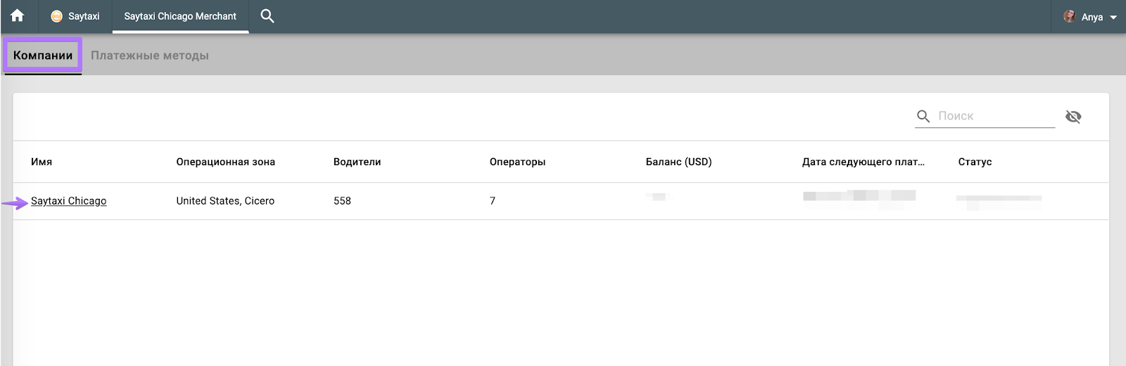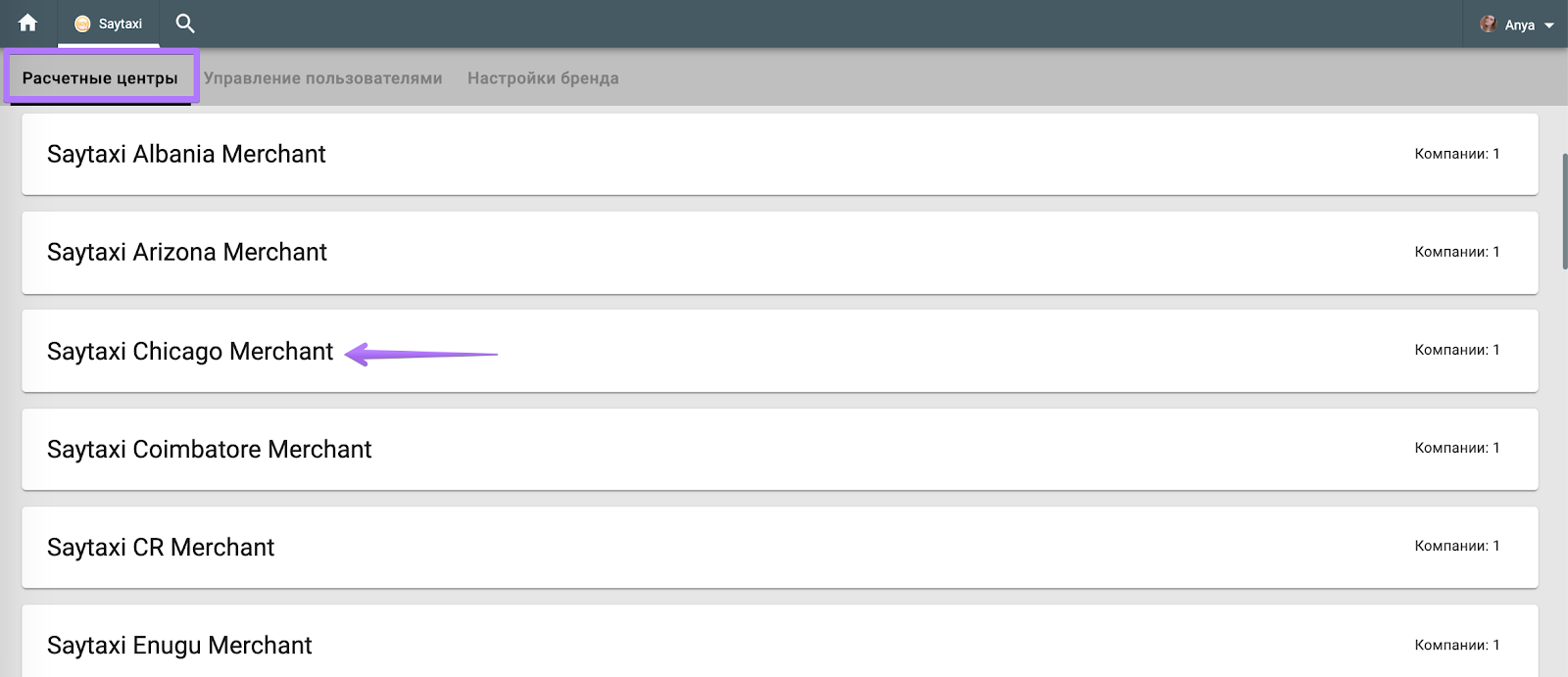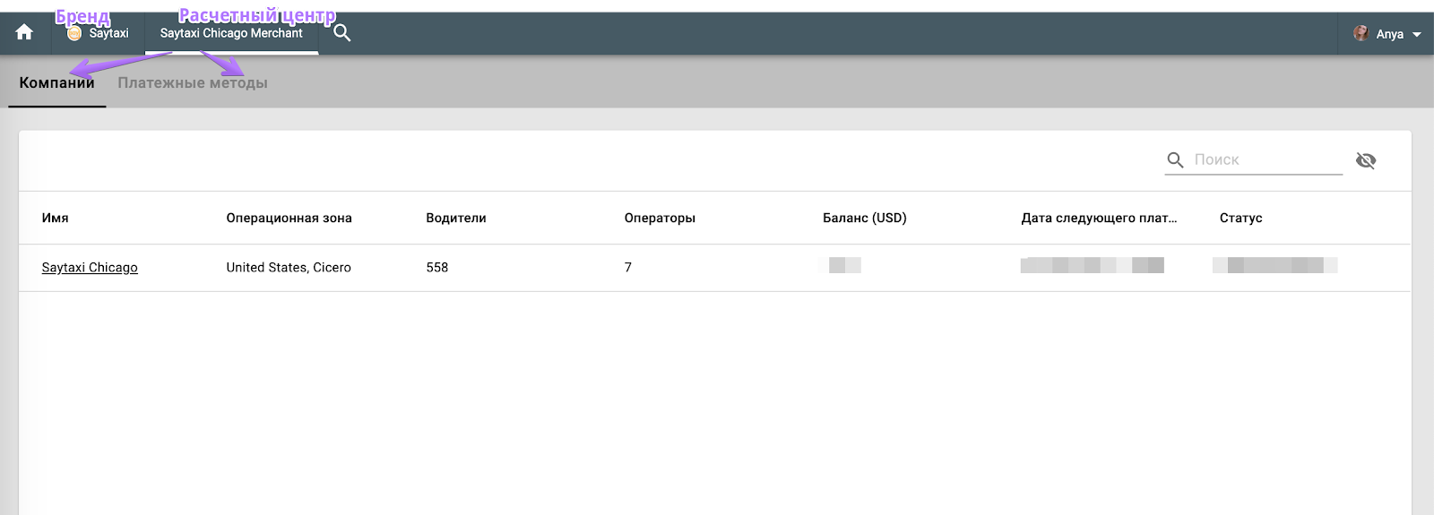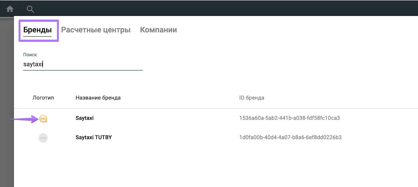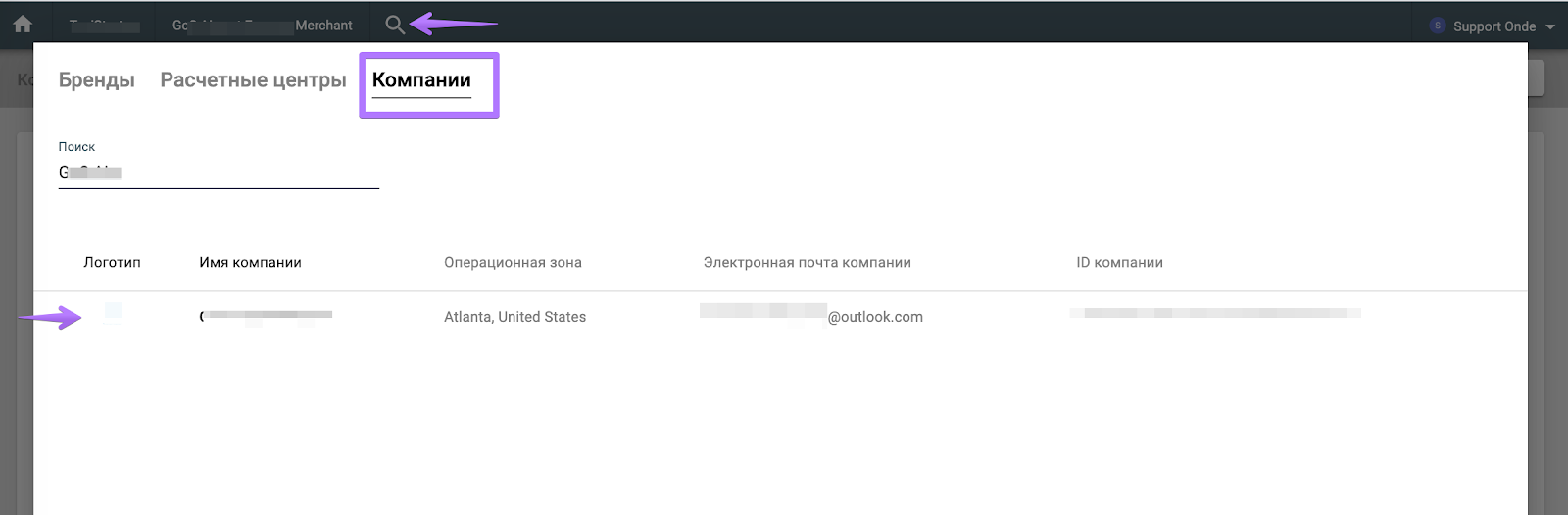 Опция поиска позволяет легко переключаться между всеми уровнями бренда: Бренды, Расчетные центры, Компании.