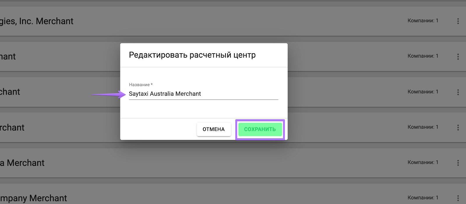 Чтобы изменить название расчетного центра, откройте вкладку Расчетные центры > выберите расчетный центр, который хотите изменить > кнопка “Еще” > Редактировать > переименуйте расчетный центр в появившемся окне и нажмите “Сохранить”.