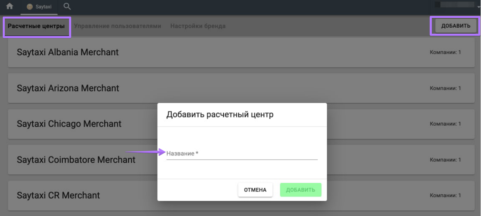 Чтобы добавить новый расчетный центр, откройте вкладку Расчетные центры > “Добавить” > введите название нового расчетного центра >> для завершения нажмите “Добавить”.