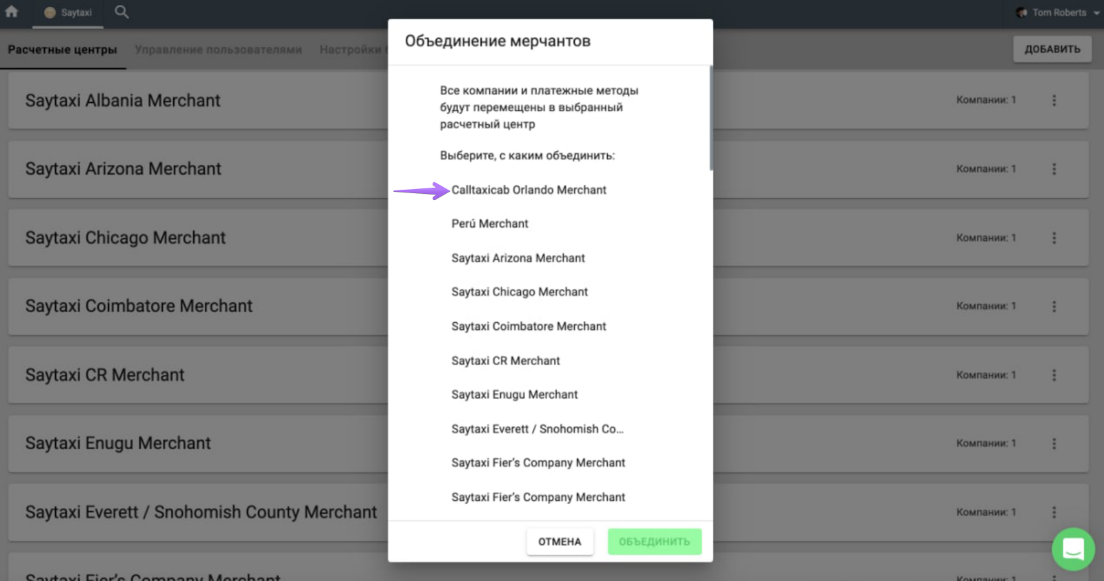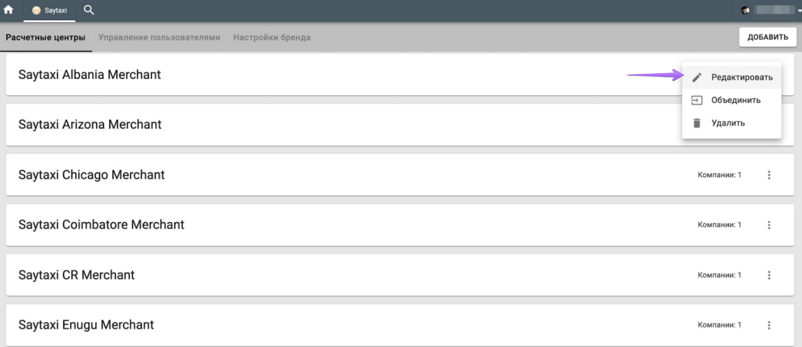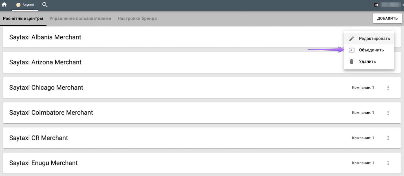 Чтобы объединить расчетные центры, откройте вкладку Расчетные центры > выберите расчетный центр, который хотите объединить > кнопка “Еще” > Объединить > укажите расчетный центр, с которым хотите объединить выбранный расчетный центр. После этого все компании и платежные методы предыдущего расчетного центра будут перенесены в указанный расчетный центр. Предыдущий расчетный центр будет удален.