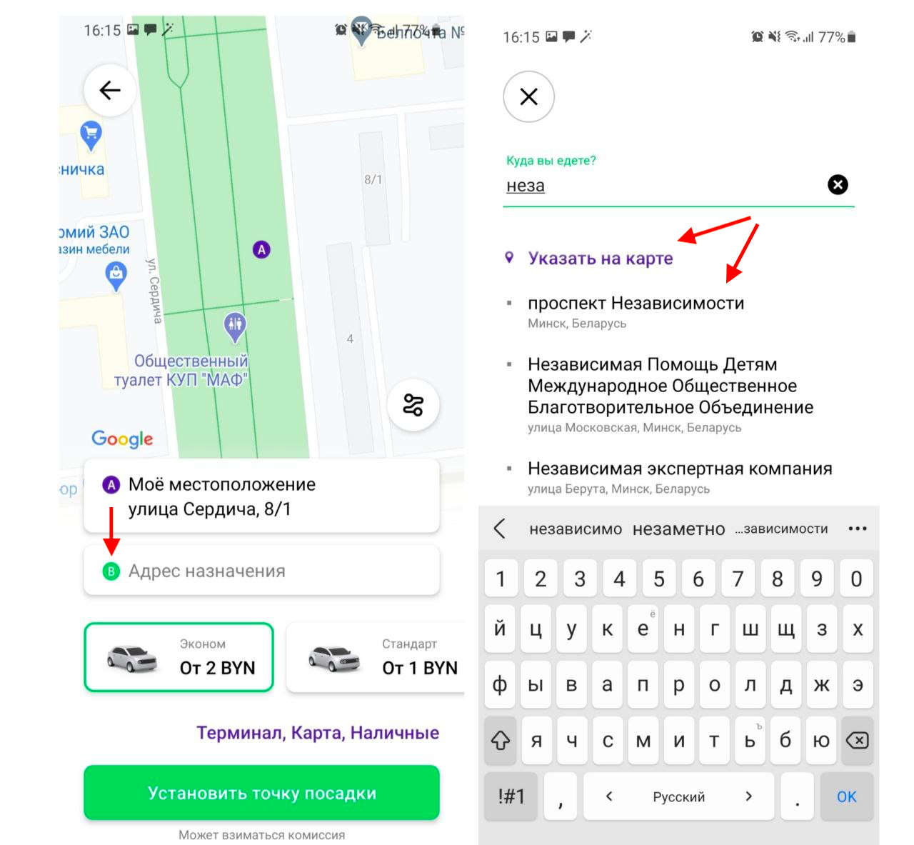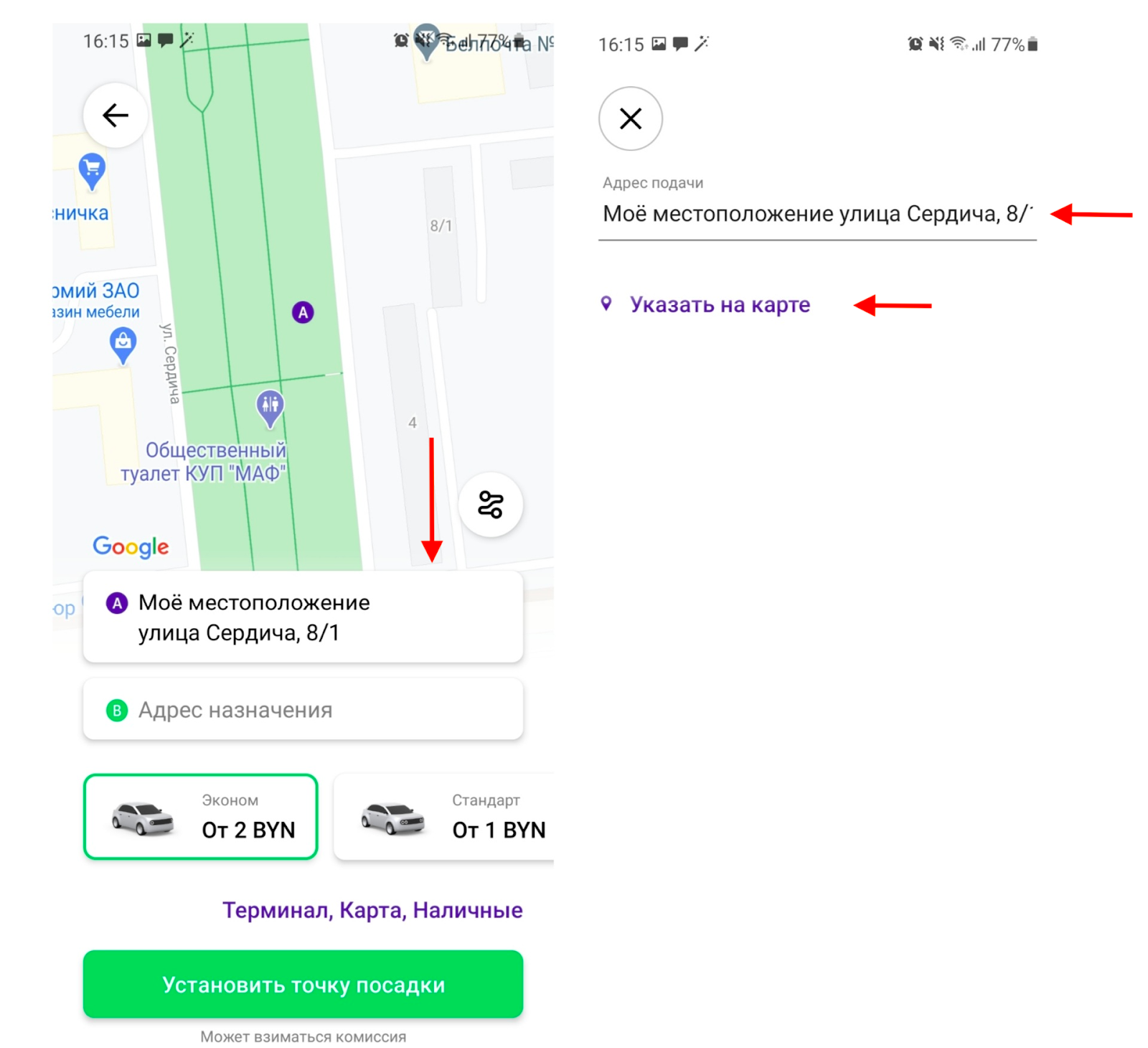 На втором экране ваше физическое местоположение по умолчанию определяется как “точка посадки”. Однако в случае, если вам нужен другой адрес подачи авто, просто нажмите на поле с адресом и обновите его в адресной строке или нажмите “Указать на карте”.