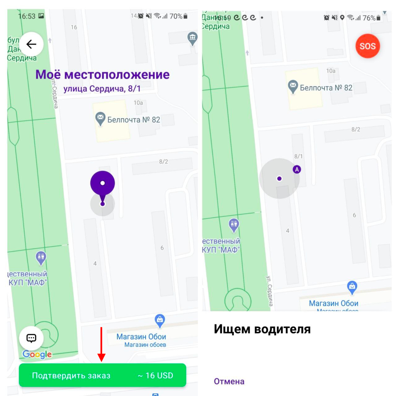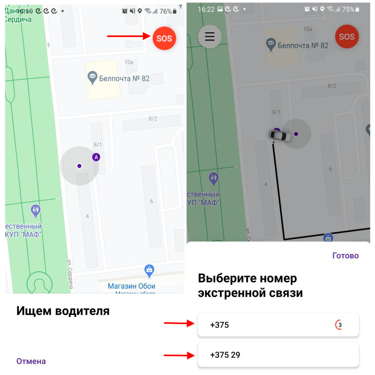 Кнопка SOS отображается с момента, когда заказ отправляется водителям, до тех пор, пока поездка не будет завершена и оплачена.