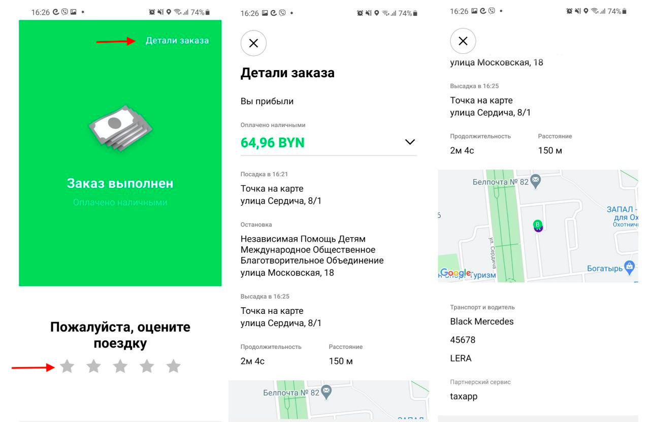 На последнем экране вы можете просмотреть “Детали заказа” и оценить поездку.