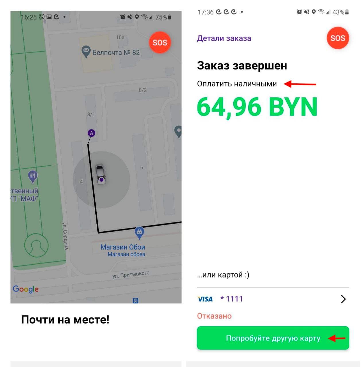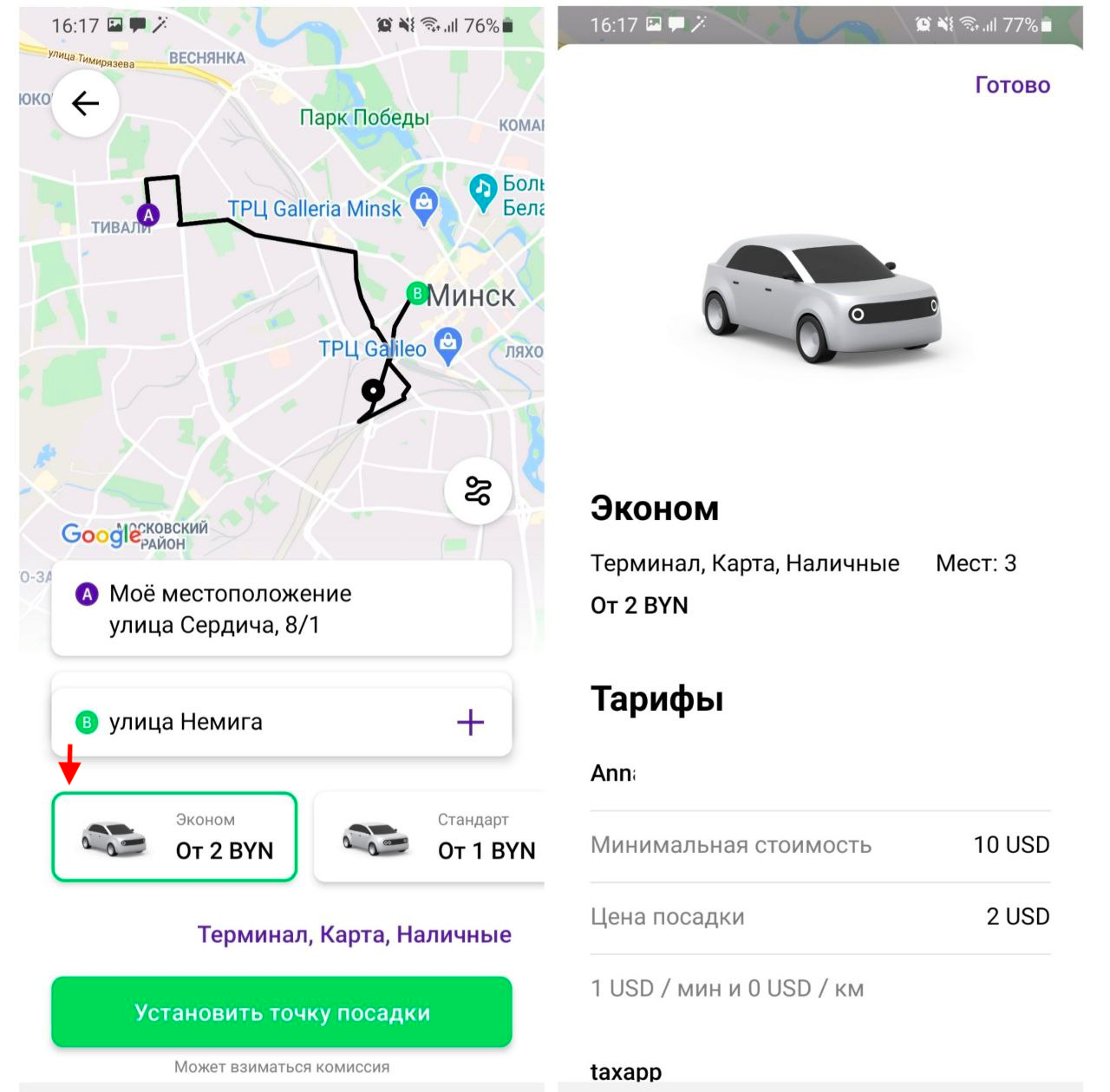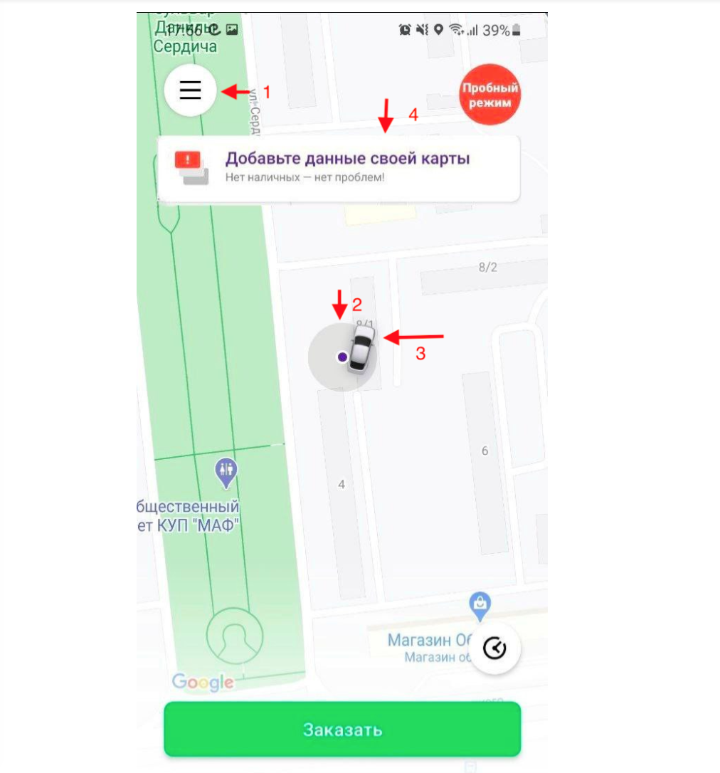 Приложение уведомит вас, как только водитель подъедет к адресу назначения. После того, как водитель нажмет “завершить поездку” и подтвердит окончательную стоимость, вы сможете выбрать способ оплаты (в случае, если предварительно выбраны наличные или терминал) или средства будут автоматически списаны с карты (если такой способ доступен и другой способ оплаты не был выбран заранее перед поездкой).