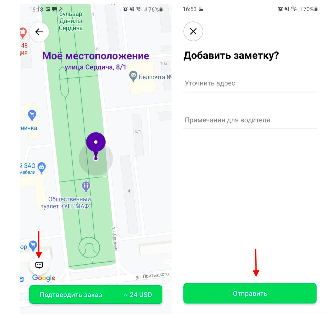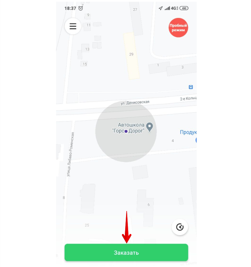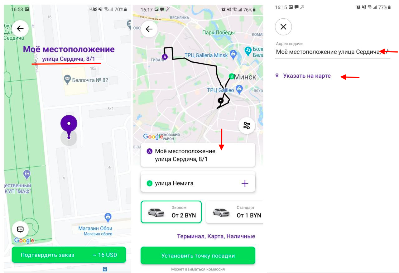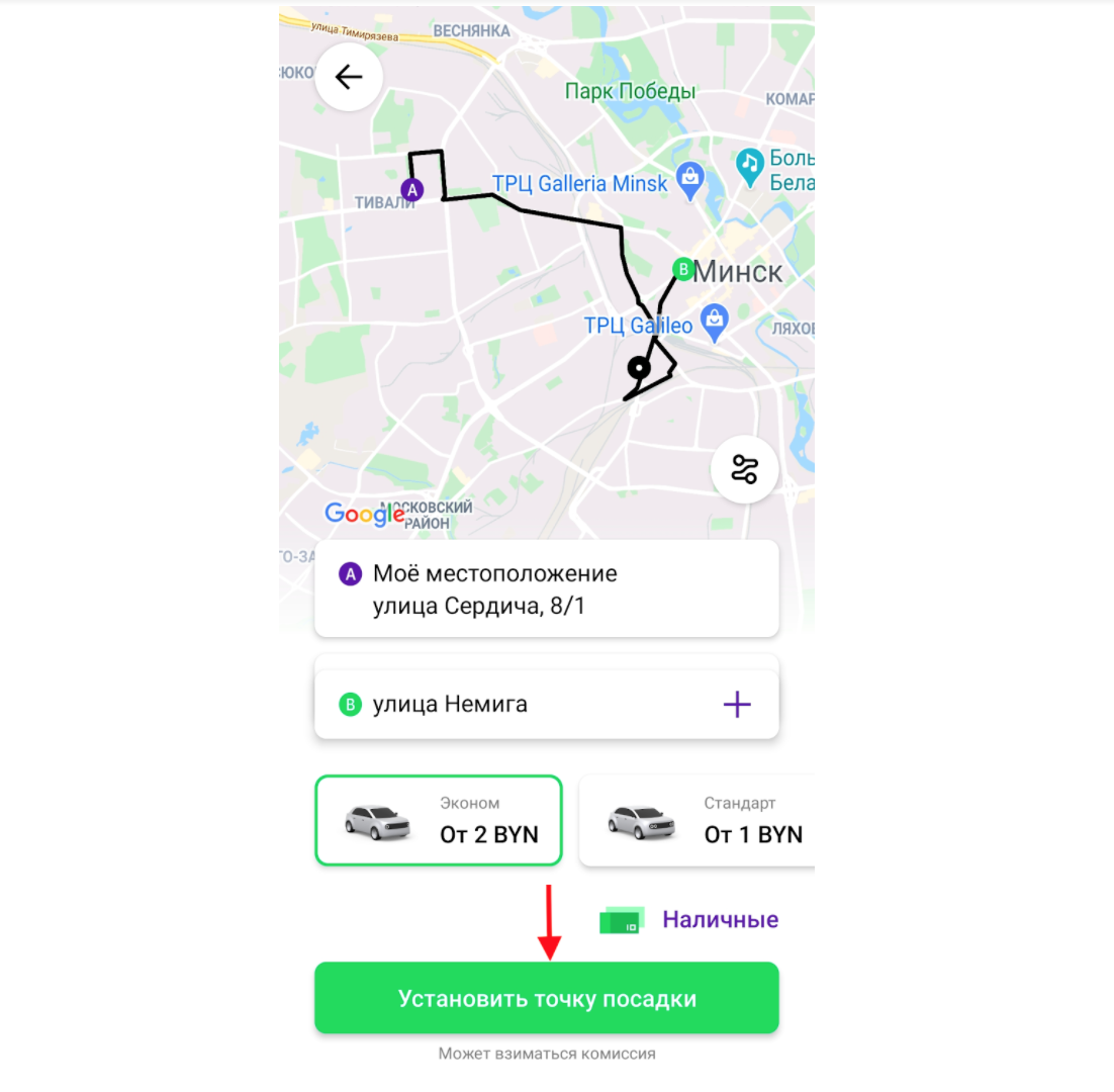 Перед подтверждением заказа обязательно проверьте, правильно ли указана точка посадки. Вы можете нажать на значок “Стрелка назад”, чтобы изменить ее.