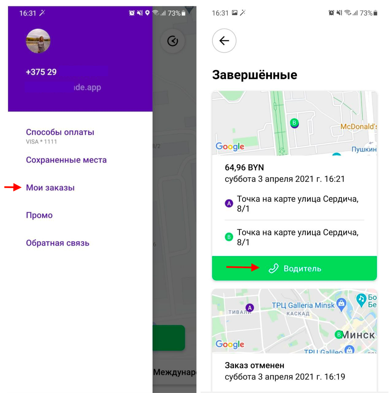 Вся информация о прошлых и запланированных заказах хранится в хронологическом порядке во вкладке “Мои заказы”. Чтобы просмотреть историю заказов, откройте боковое меню профиля в приложении и выберите “Мои заказы”.
