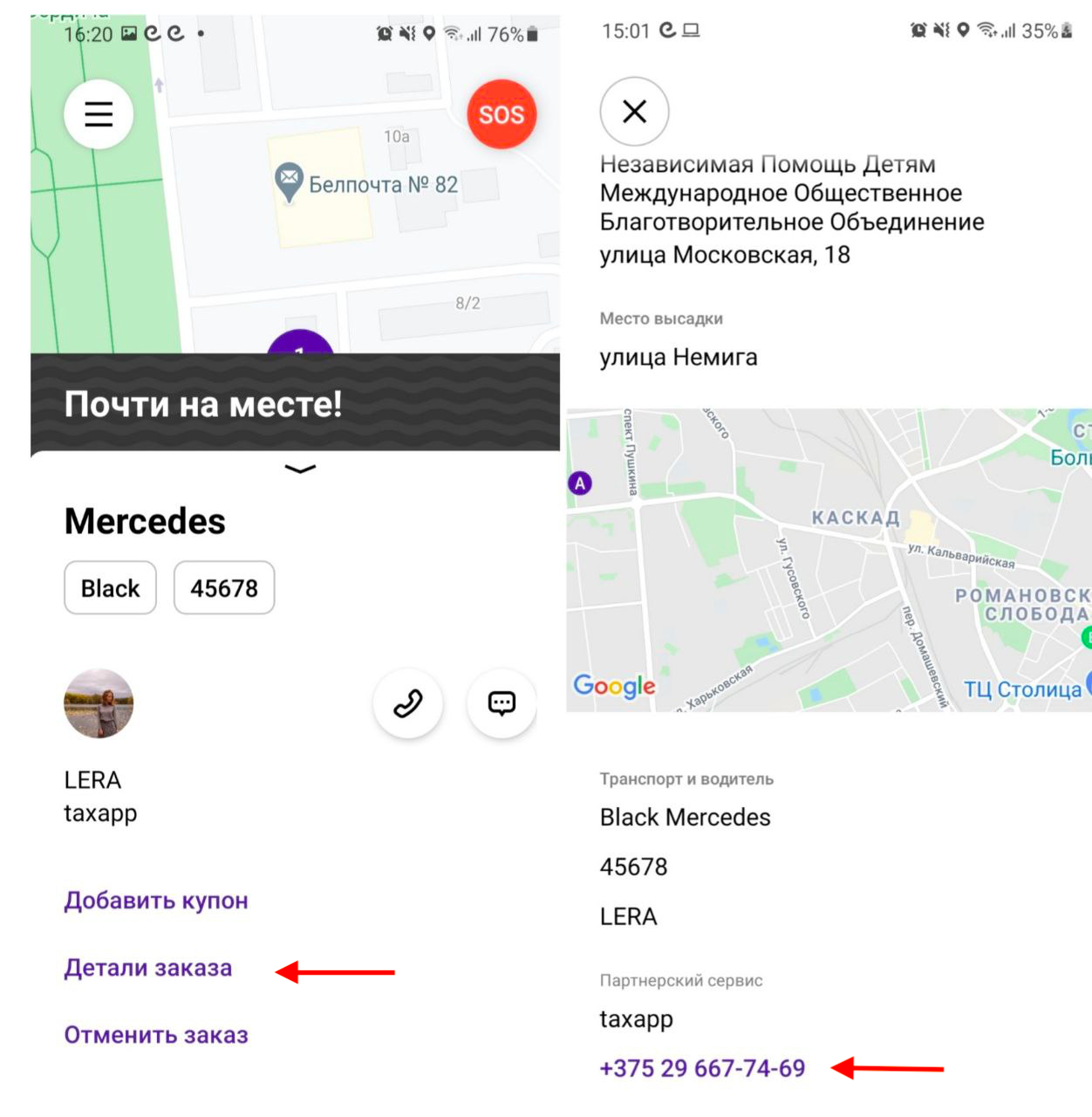 После того, как заказ принят и до того, как водитель завершит поездку, вы можете просмотреть “Детали заказа”: данные о водителе/транспортном средстве, адрес посадки/адрес назначения, номер телефона компании.