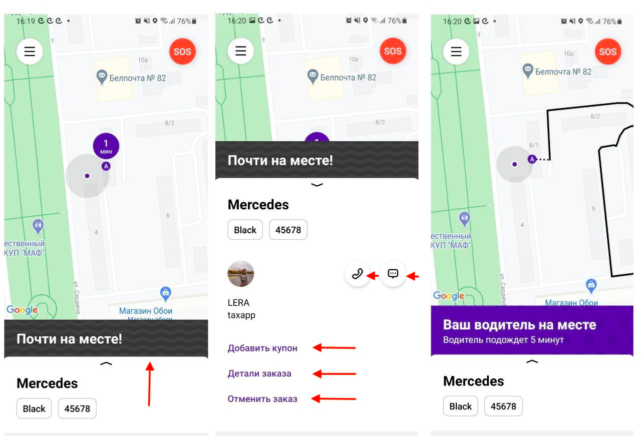 С момента принятия заказа водителем (см. скриншоты выше) вы можете: