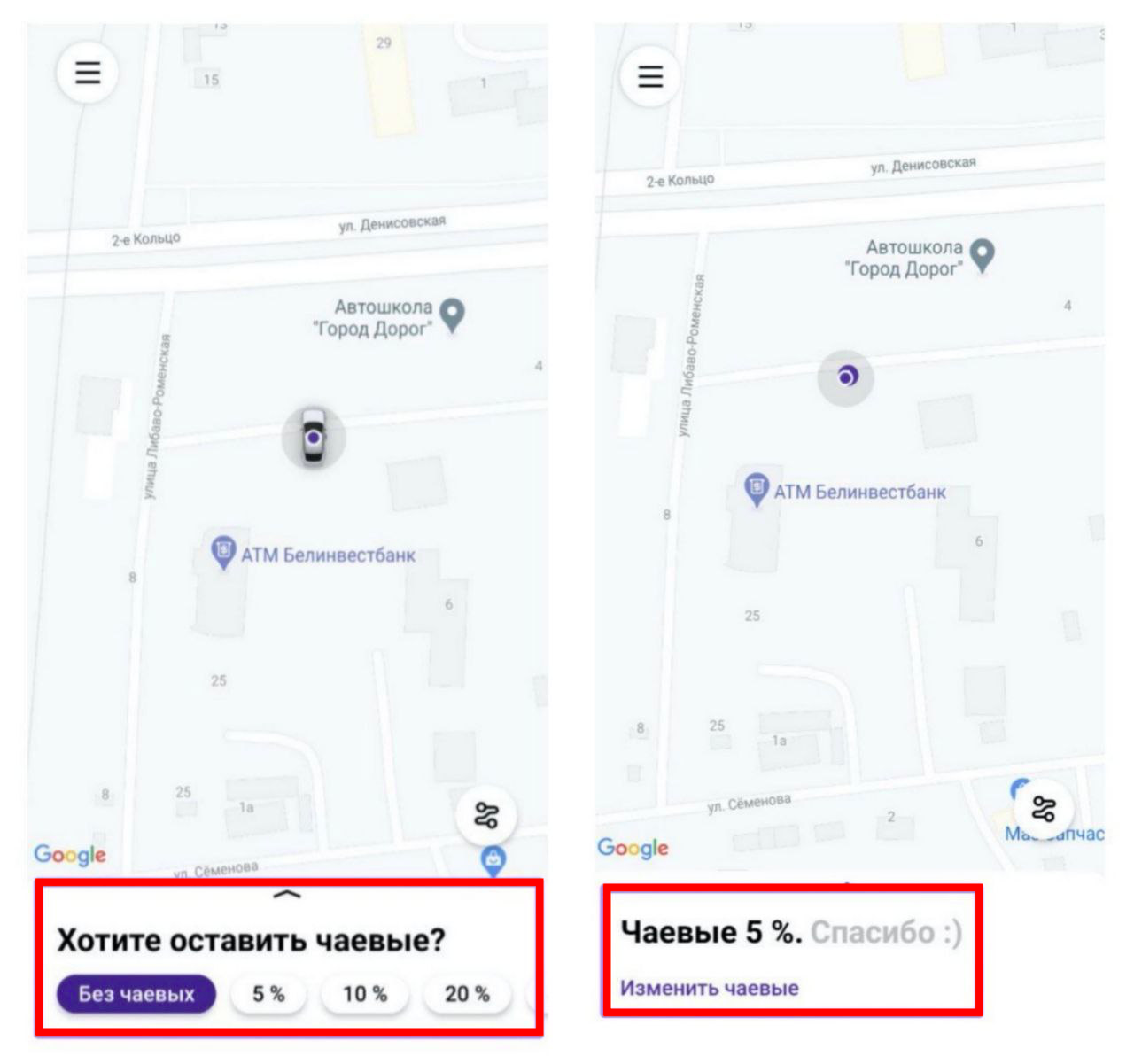 Когда вы находитесь в машине и водитель нажал “начать поездку”, на экране приложения клиента отображается: