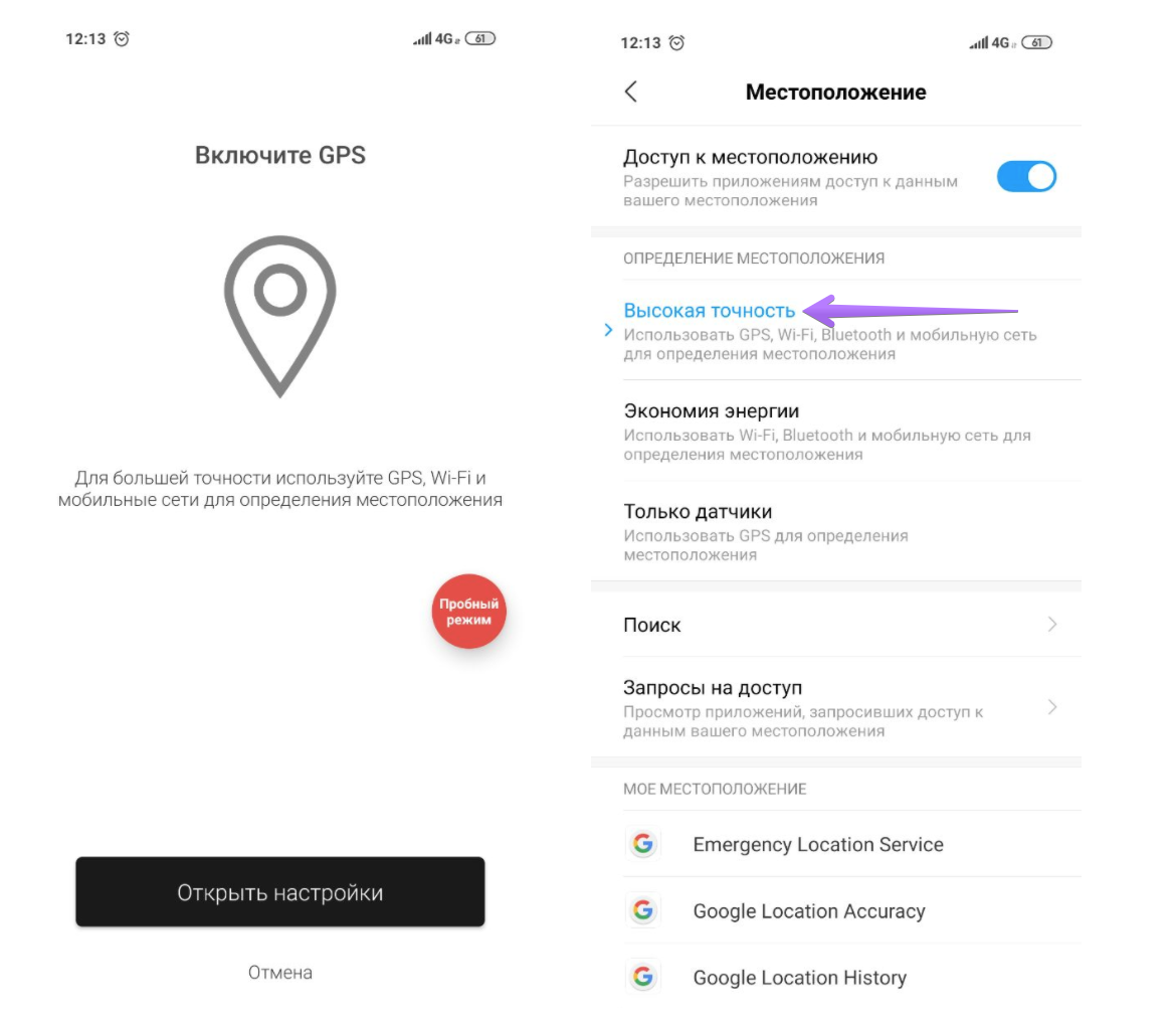 Если водитель видит уведомление “Для большей точности используйте GPS, Wi-Fi и мобильные сети для определения местоположения”, ему необходимо открыть на своем устройстве настройки определения местоположения и выбрать “Высокая точность”.