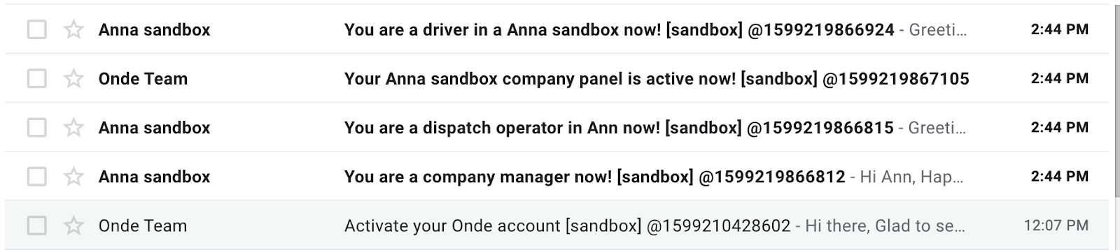 После активации sandbox аккаунта в вашей компании автоматически будут зарегистрированы профили водителя/оператора/менеджера компании. Вы получите соответствующие уведомления об этом на почту, которая была использована для регистрации sandbox аккаунта.