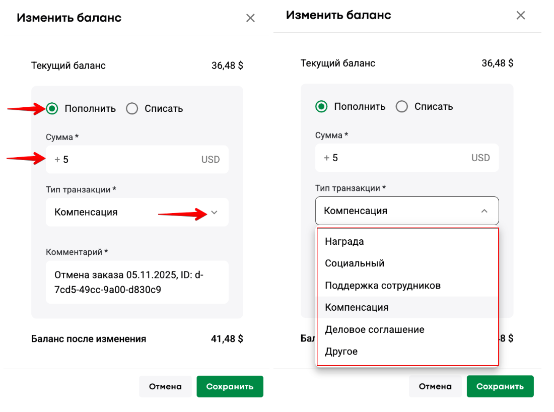 водитель приносит наличные в офис >> менеджер компании переходит к профилю водителя в My hub >> прокручивает страницу вправо и открывает дополнительное меню >> выбирает “Изменить баланс” >> "Пополнить" >> вводит необходимую сумму для пополнения баланса >> при необходимости выбирает тип транзакции (по умолчанию выбрано "Другое") >> указывает что-либо в поле “Комментарий” >> нажимает “Сохранить”: