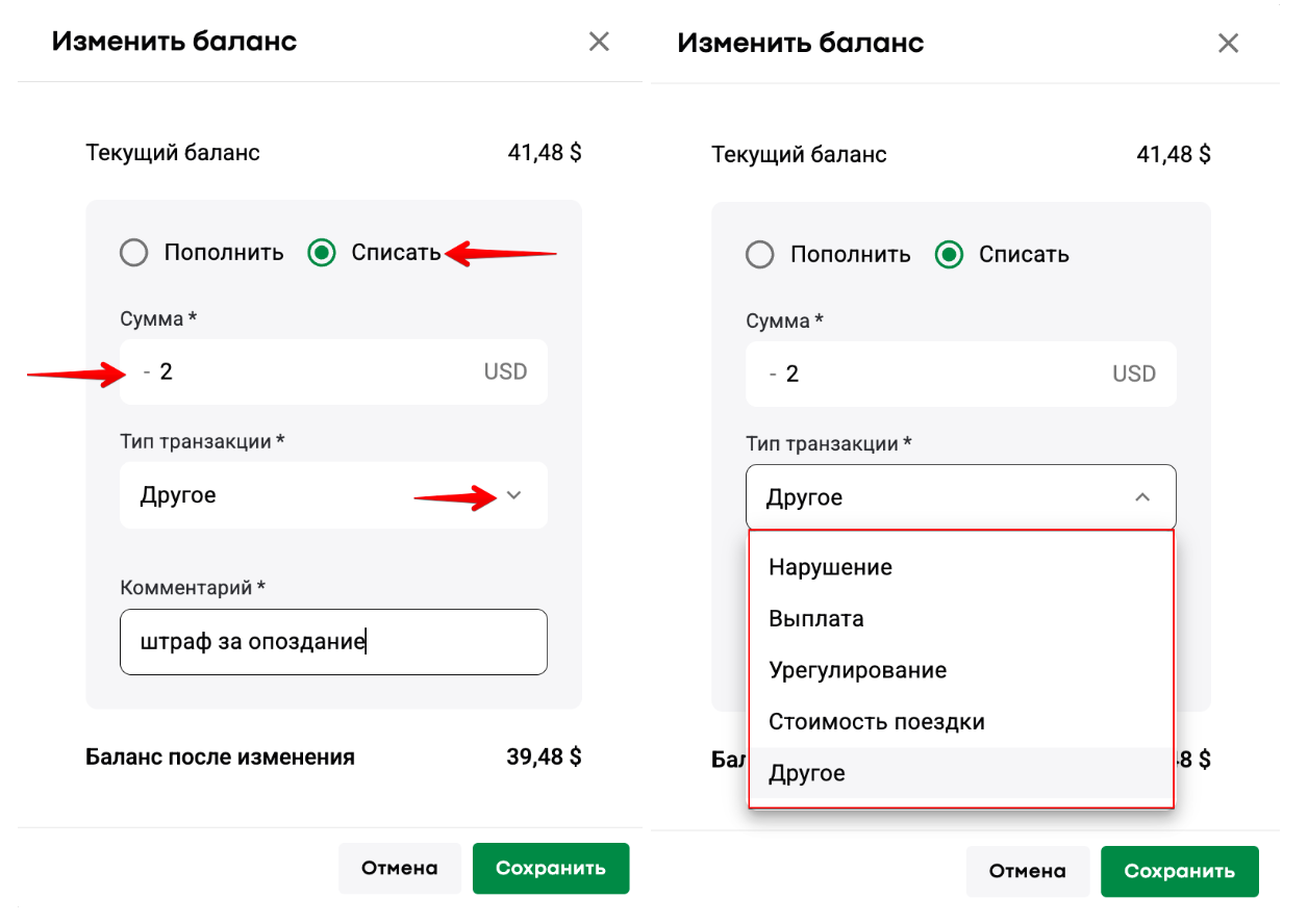 Менеджер компании должен перейти к профилю водителя в My hub >> прокрутить страницу вправо и открыть дополнительное меню >> выбрать “Изменить баланс” >> "Списать" >> ввести необходимую сумму для списания >> при необходимости выбрать тип транзакции (по умолчанию выбрано "Другое") >> указать что-либо в поле “Комментарий” >> нажать “Сохранить”: