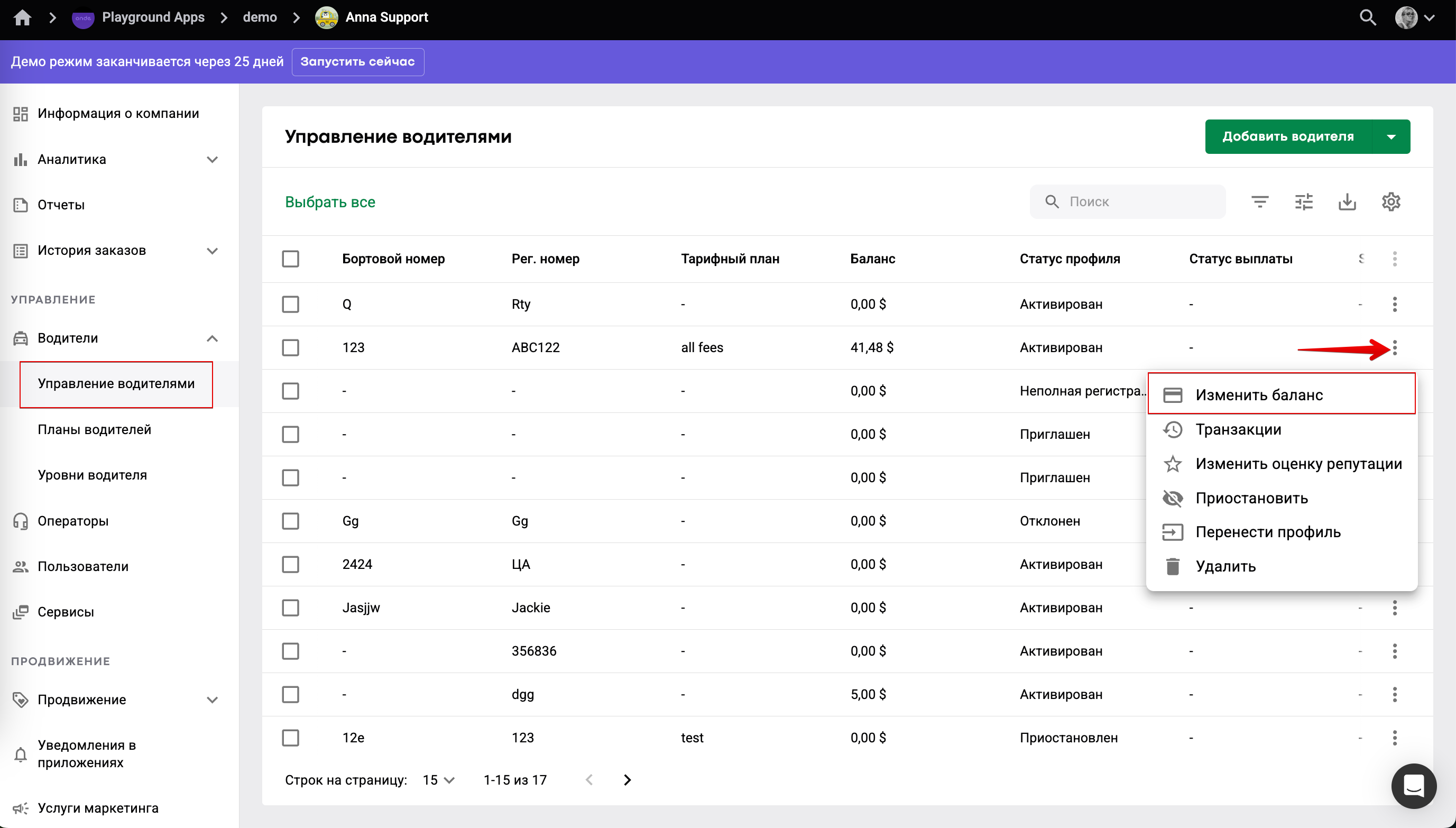 2. В профиле водителя в My hub через опцию "Изменить баланс":
