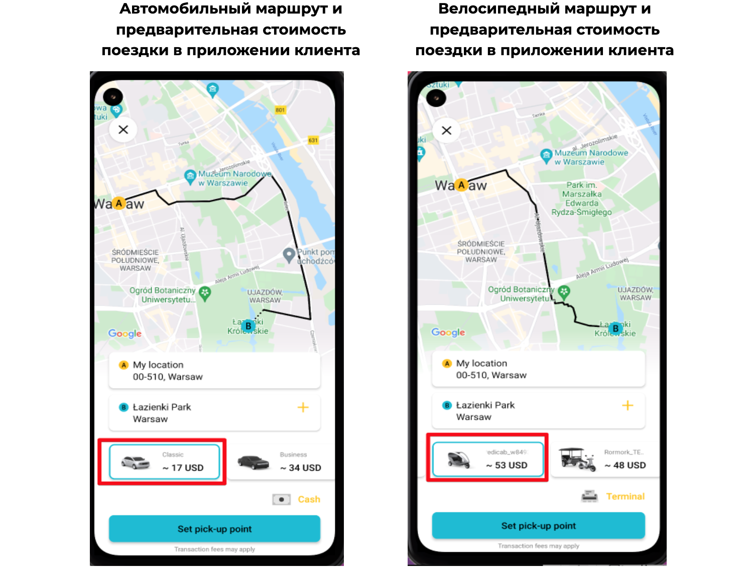 Как показано на скриншоте ниже, Geogate строит разный предварительный маршрут между одинаковыми точками посадки и высадки в зависимости от типа маршрута, выбранного для типа авто.