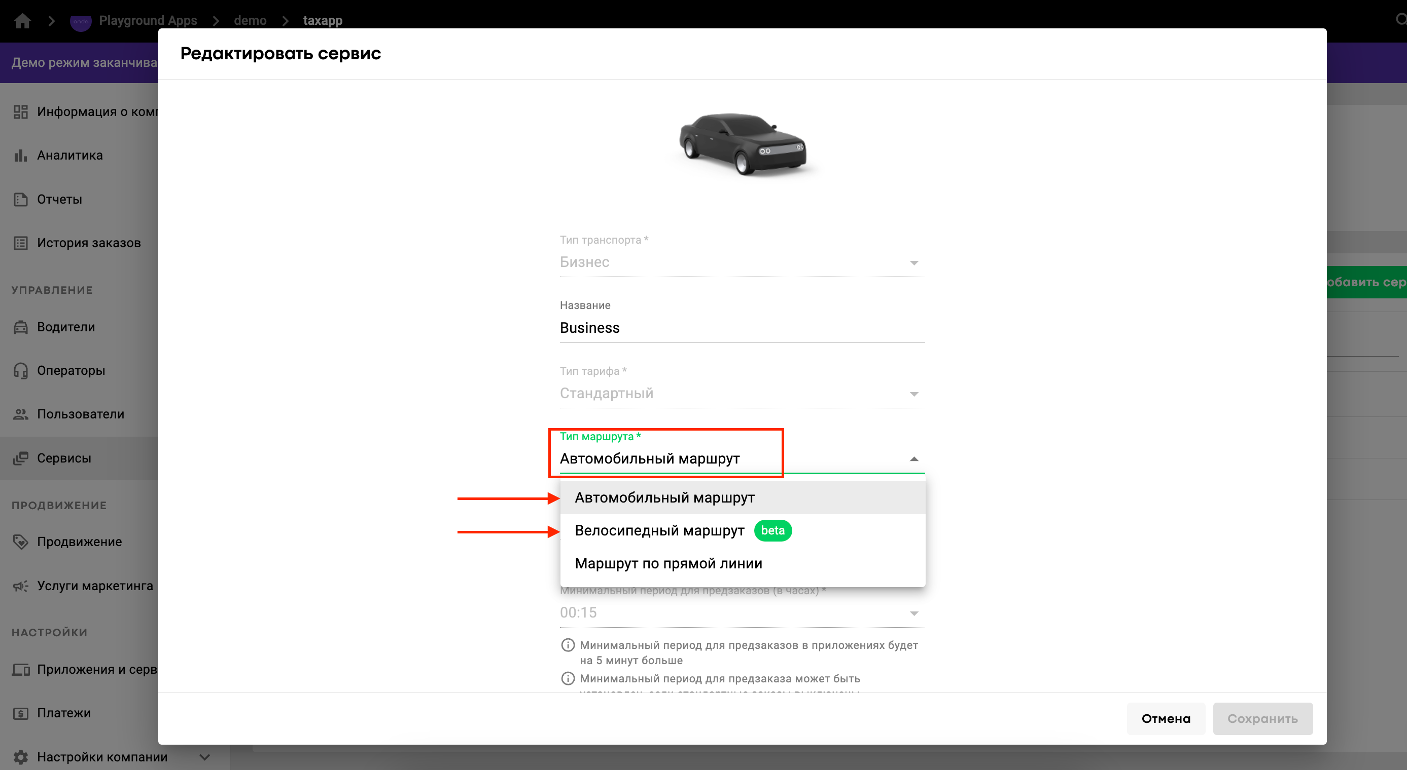 Чтобы выбрать тип маршрута для типа авто, откройте My hub, перейдите во вкладку Управление компанией, выберите вкладку Сервисы, откройте нужный тип сервиса, перейдите в раздел Общие настройки и выберите нужный тип маршрута в выпадающем списке “Тип маршрута”: