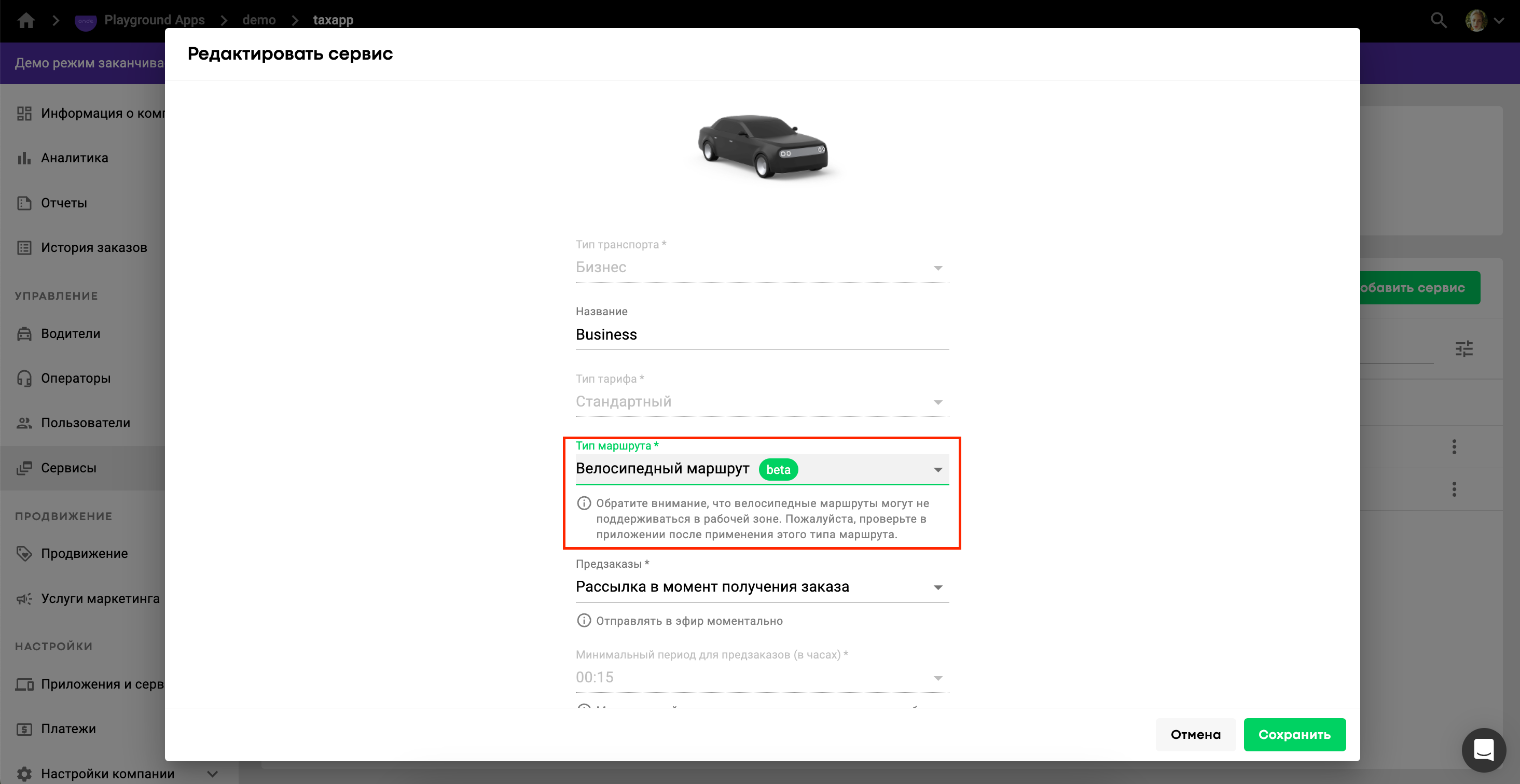 Geogate использует выбранный в настройках сервиса режим для построения маршрутов в приложениях водителя, клиента и оператора (временно недоступно).