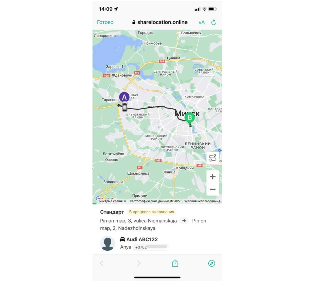Опция “поделиться статусом заказа” становится доступной после того, как водитель принял заказ.